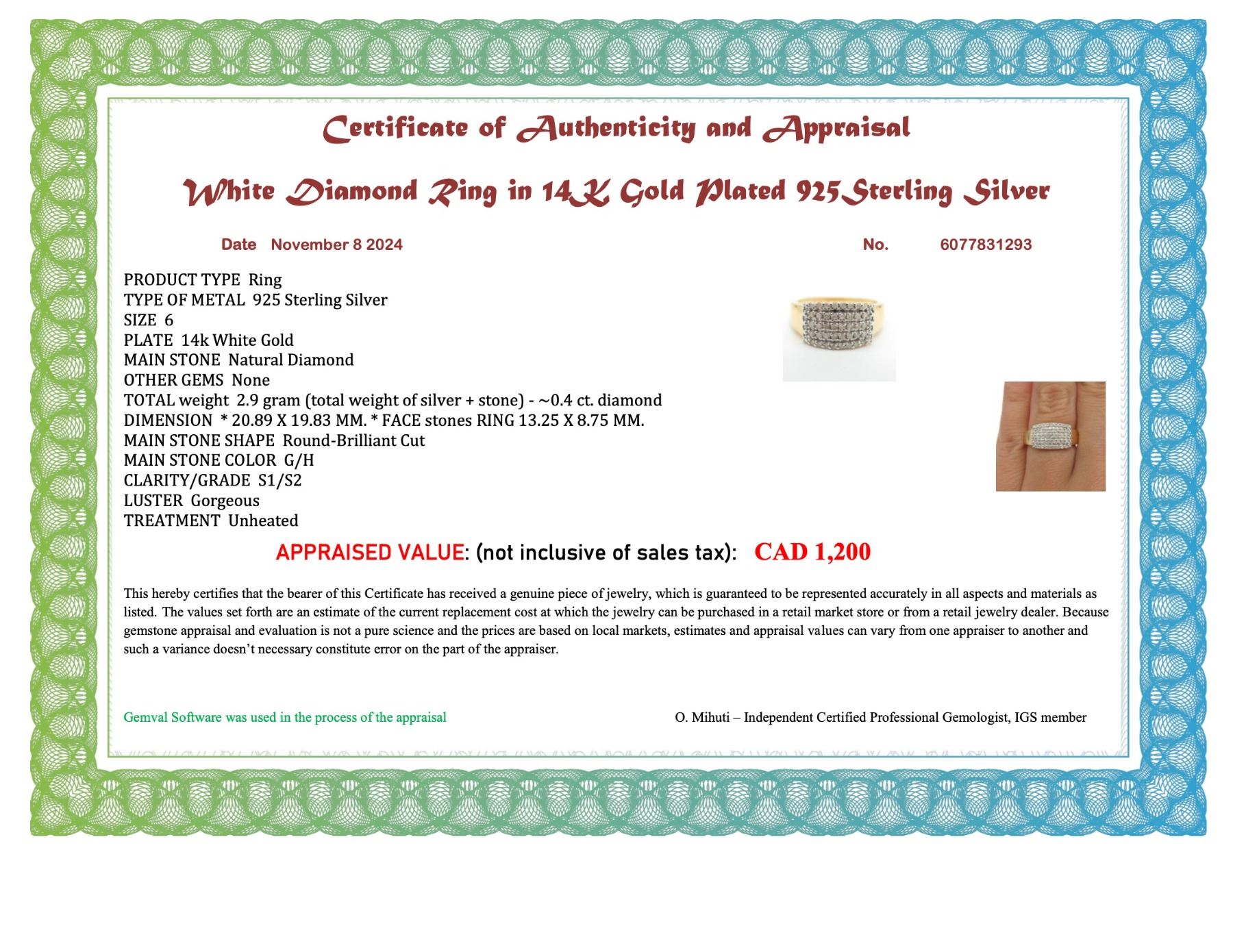 0.4 ct. NATURAL WHITE DIAMOND RING in 14K White Gold plated 925 Sterling Silver – Size 6 - Appraised Replacement Value CAD 1,200
