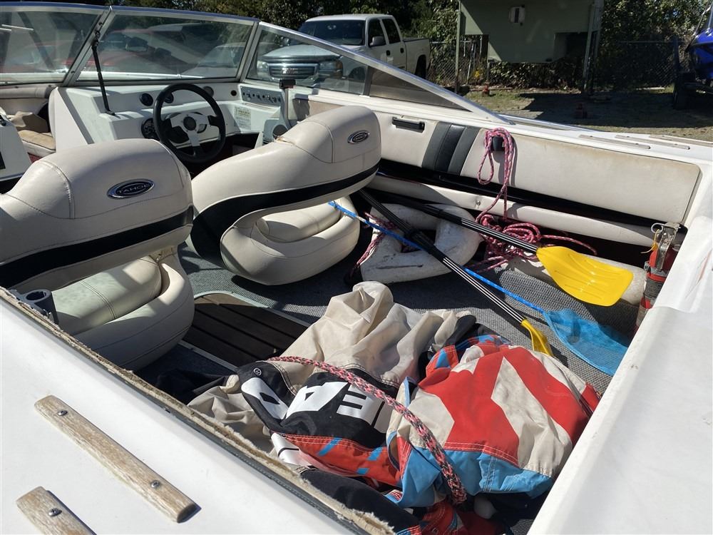 THE BOAT IS A 7 PASSAGNER, WITH A RAIDO WITH CD PLAYER, DEPTH GAGE, LEATHER SEATS, TOW POLE (AND IT EVEN COMES WITH A TUBE). THE BOATT IS POWERED BY A 200HP V36 SUZUKI OUTBOARD MOTOR, CONGSINOR DECLARES THE ENGINE WAS REBUILT LAST YEAR AND IT MAY NEED A NEW BATTERY. THE BOAT IS SITTING ON A 1998 SPECTERA 21'Apx TRAILER. THE TRAILER HAS GOOD TIRES AND THE BALL SIZE IS 2INCH.