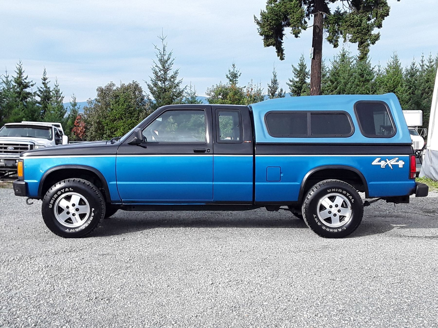 Manual transmission and 4.3 Litre Engine,6 cylinder , Four Wheel Drive, 115543 KilometersBlue ,4 PassengerDeclarations -, Damage Claims, 3 CLAIMS & 1 GLASS TOTAL $4948 , Power Steering, Power Brakes, Intermittent Wipers, Dual Air Bag, AM/FM Stereo , Rear Defroster, Bucket Seats, Anti Lock Brakes, Front Disc Brakes, Tilt Steering, Cruise Control, Alloy Wheels, Canopy, Box LinerAuction Notes : Bucket Seats, Tachometer, Good Tire Tread, Runs & Drives Good