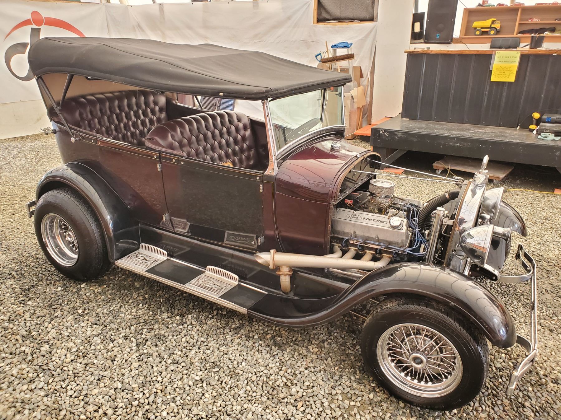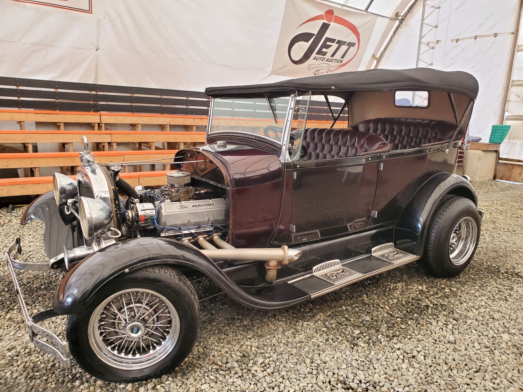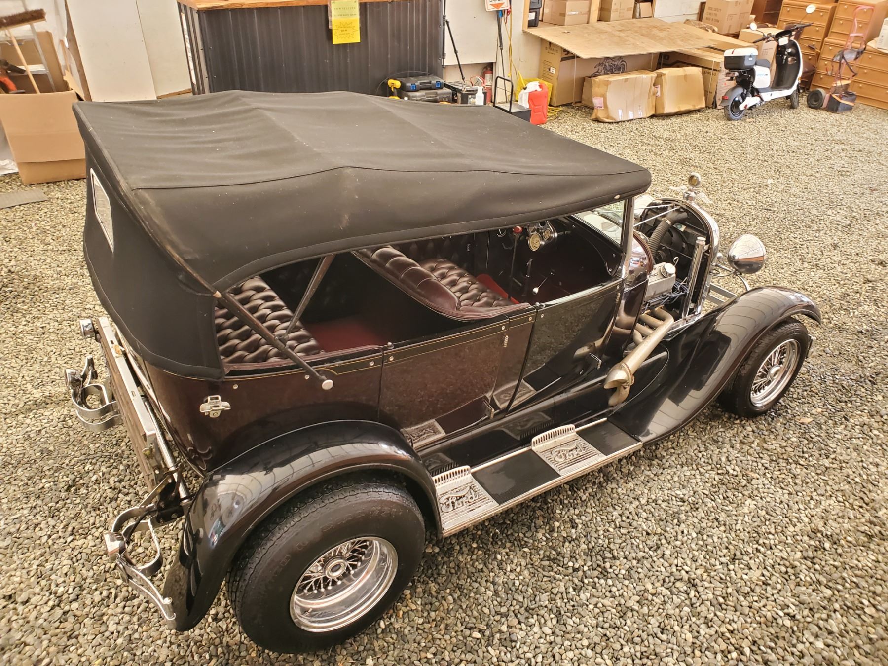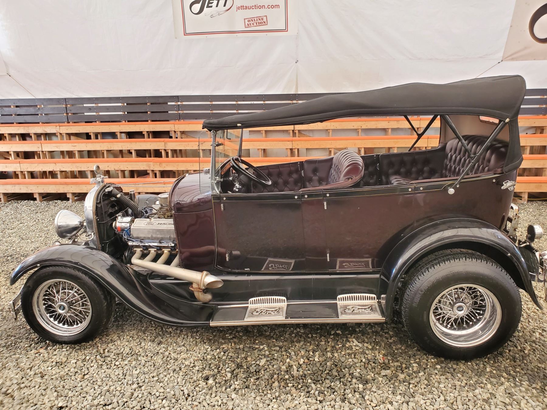 This 1929 Ford Model A Phaeton features bodywork finished in High gloss maroon paint with black fenders over Maroon upholstery, and power comes from a Ford VF8 Racing Engine paired with three-speed Automatic transmission. Features include a Black soft top, chrome bumpers, dual taillights, running boards with Ford-branded step plates, glass wind wings, a wire grille guard, a MotoMeter radiator cap, High rise Edelbrock intake and Edelbrock carburetor and Chrome wire wheels. Odometer shows 18643 Miles (True Milage Unknown). No Key