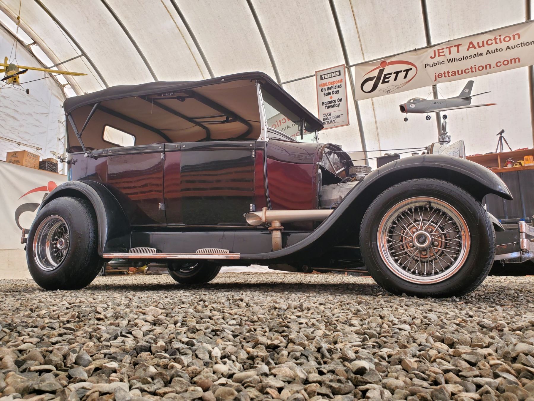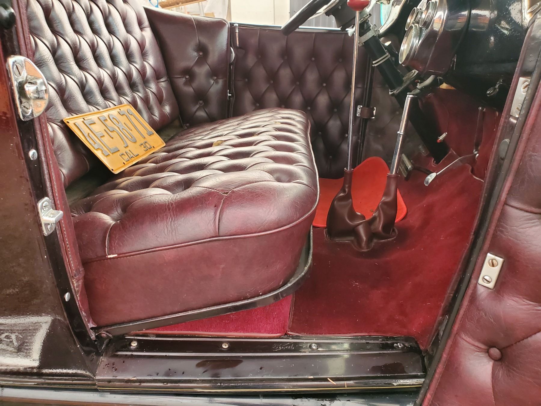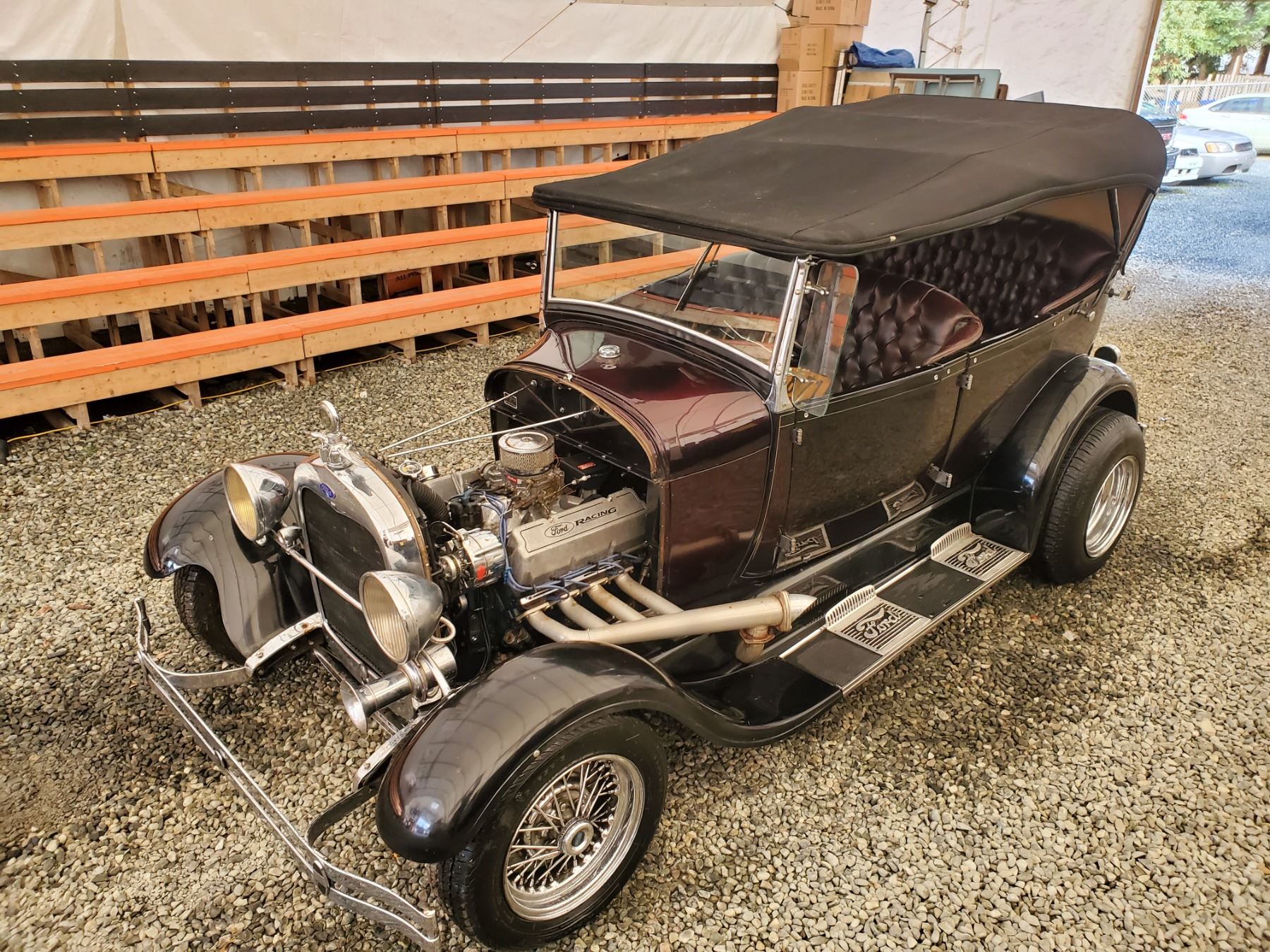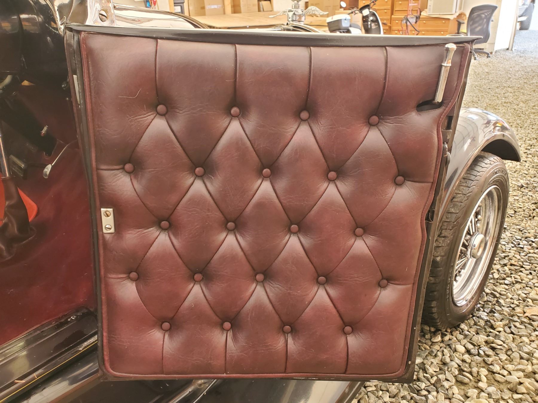 This 1929 Ford Model A Phaeton features bodywork finished in High gloss maroon paint with black fenders over Maroon upholstery, and power comes from a Ford VF8 Racing Engine paired with three-speed Automatic transmission. Features include a Black soft top, chrome bumpers, dual taillights, running boards with Ford-branded step plates, glass wind wings, a wire grille guard, a MotoMeter radiator cap, High rise Edelbrock intake and Edelbrock carburetor and Chrome wire wheels. Odometer shows 18643 Miles (True Milage Unknown). No Key