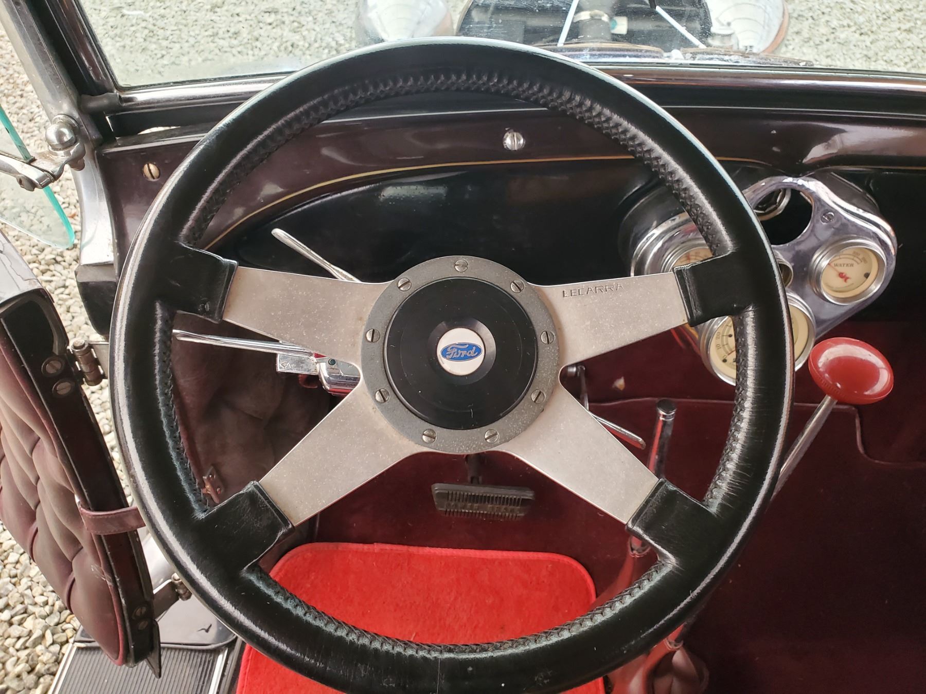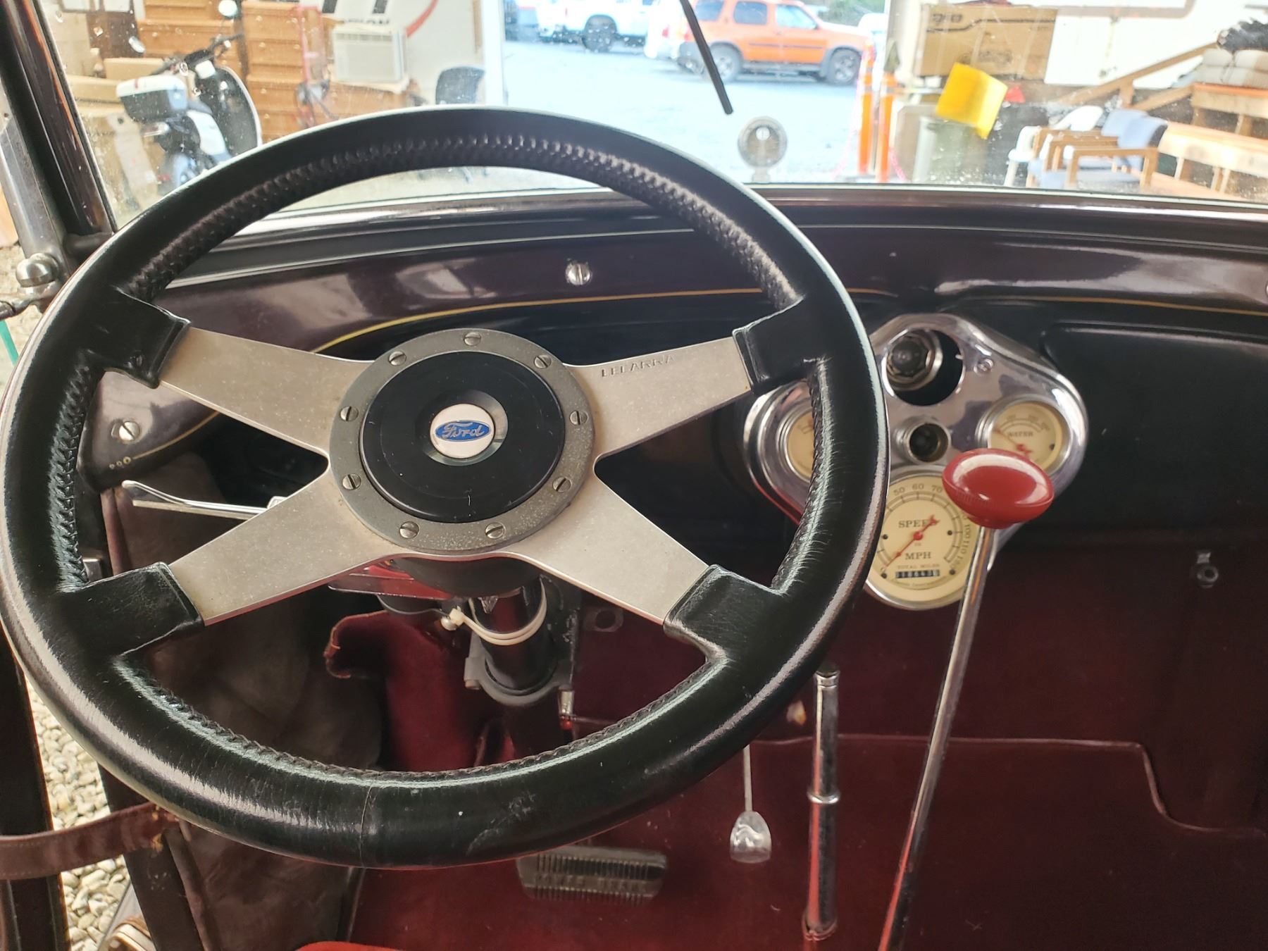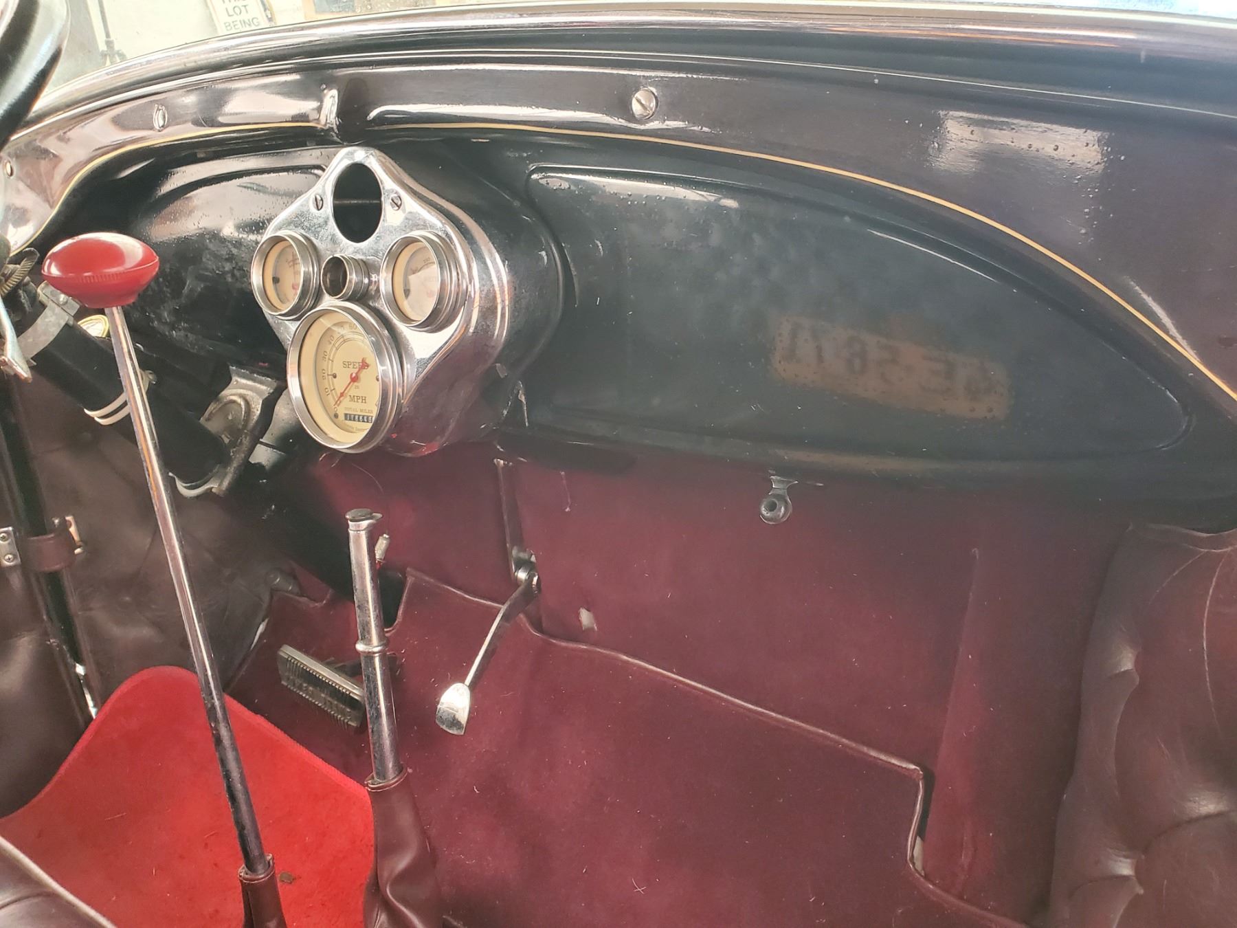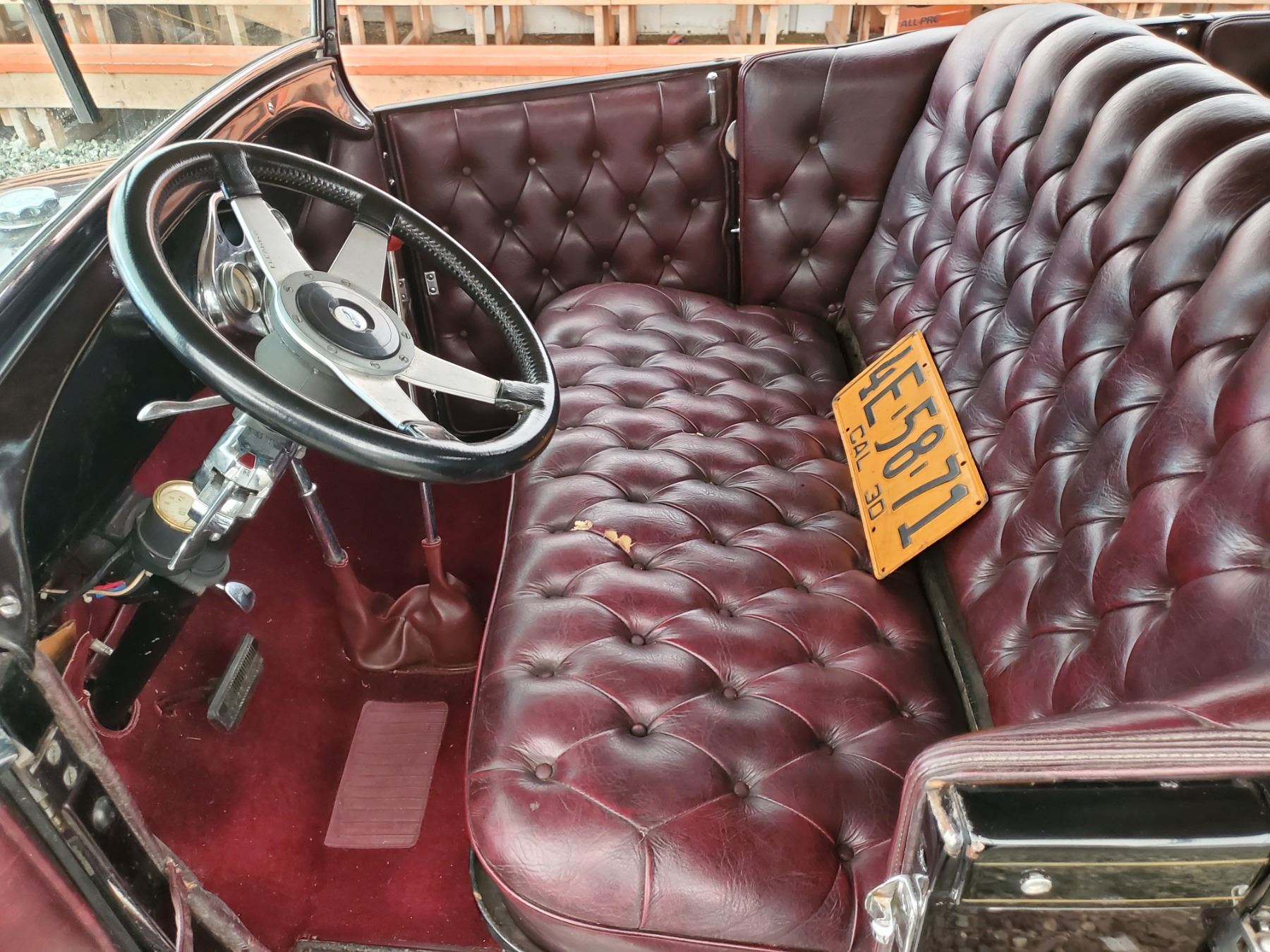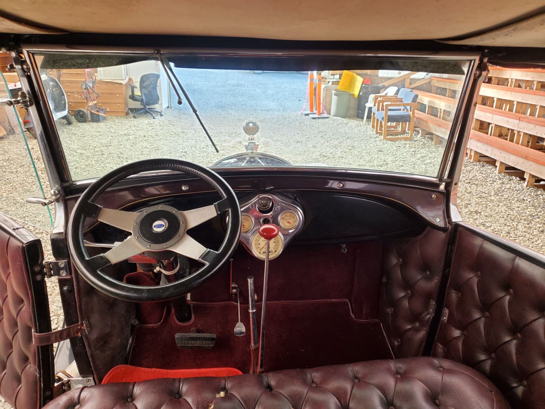 This 1929 Ford Model A Phaeton features bodywork finished in High gloss maroon paint with black fenders over Maroon upholstery, and power comes from a Ford VF8 Racing Engine paired with three-speed Automatic transmission. Features include a Black soft top, chrome bumpers, dual taillights, running boards with Ford-branded step plates, glass wind wings, a wire grille guard, a MotoMeter radiator cap, High rise Edelbrock intake and Edelbrock carburetor and Chrome wire wheels. Odometer shows 18643 Miles (True Milage Unknown). No Key