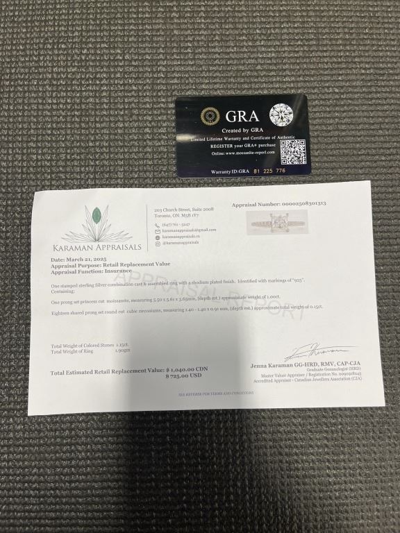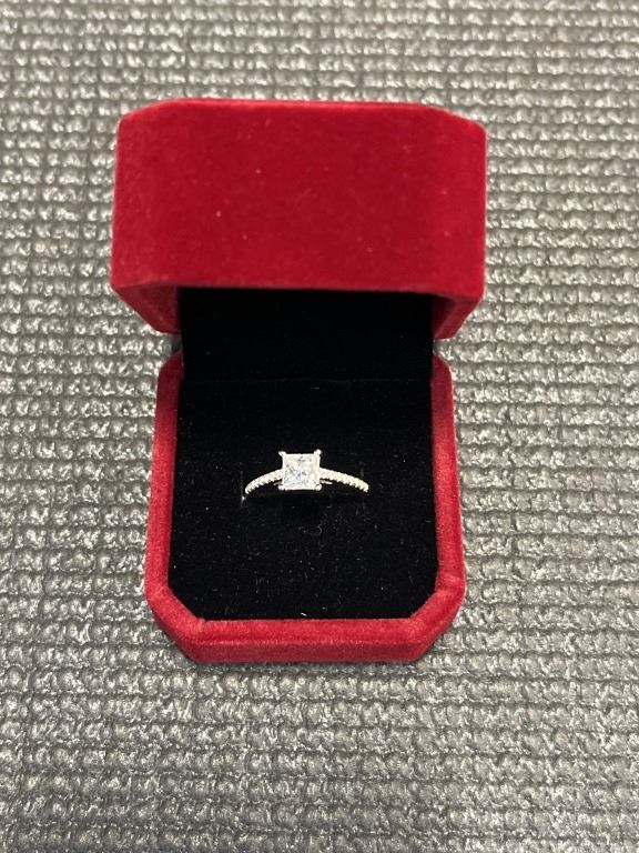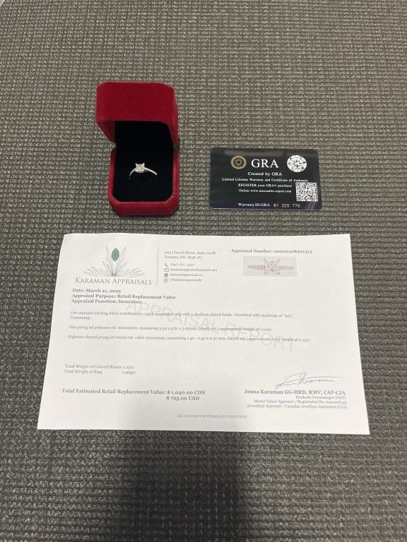 1.00 CT TW GRA CERTIFIED PRINCESS CUT MOISSANITE STONES VVS D COLOR WITH 18 STONES SET IN SHARED PRONGS IN SHANKS SET IN 925 SILVER RING SIZE 6.5 RETAIL VALUE $1,040.00