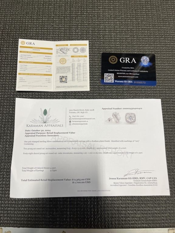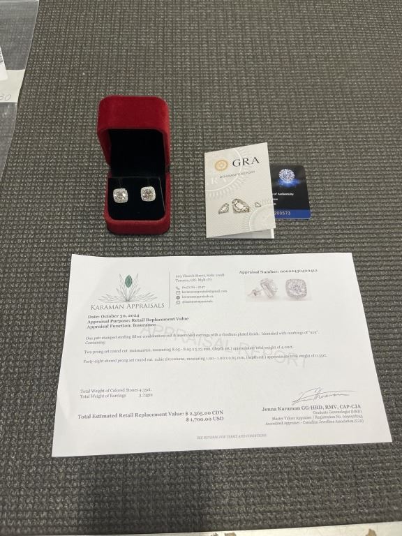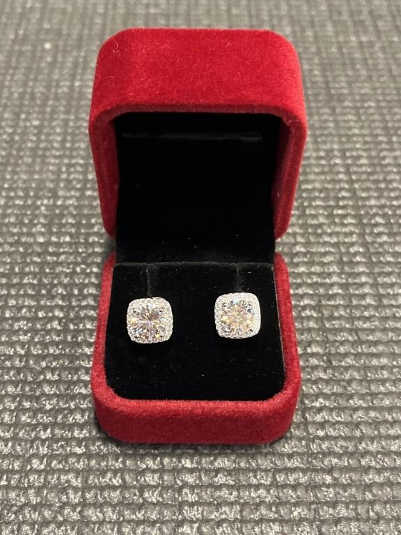 1.00 CT TW GRA CERTIFIED ROUND BRILLIANT CUT MOISSANITE STONES VVS VIVID BLUISH GREEN COLOR WITH 50 ROUND BRILLIANT CUT CUBIC ZIRCONIA SET IN SQUARE HALOS AND IN HOOPS SET IN 925 SILVER EARRINGS RETAIL VALUE $1,220.00