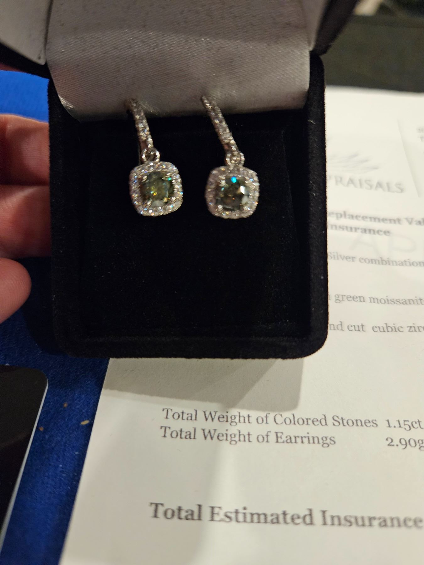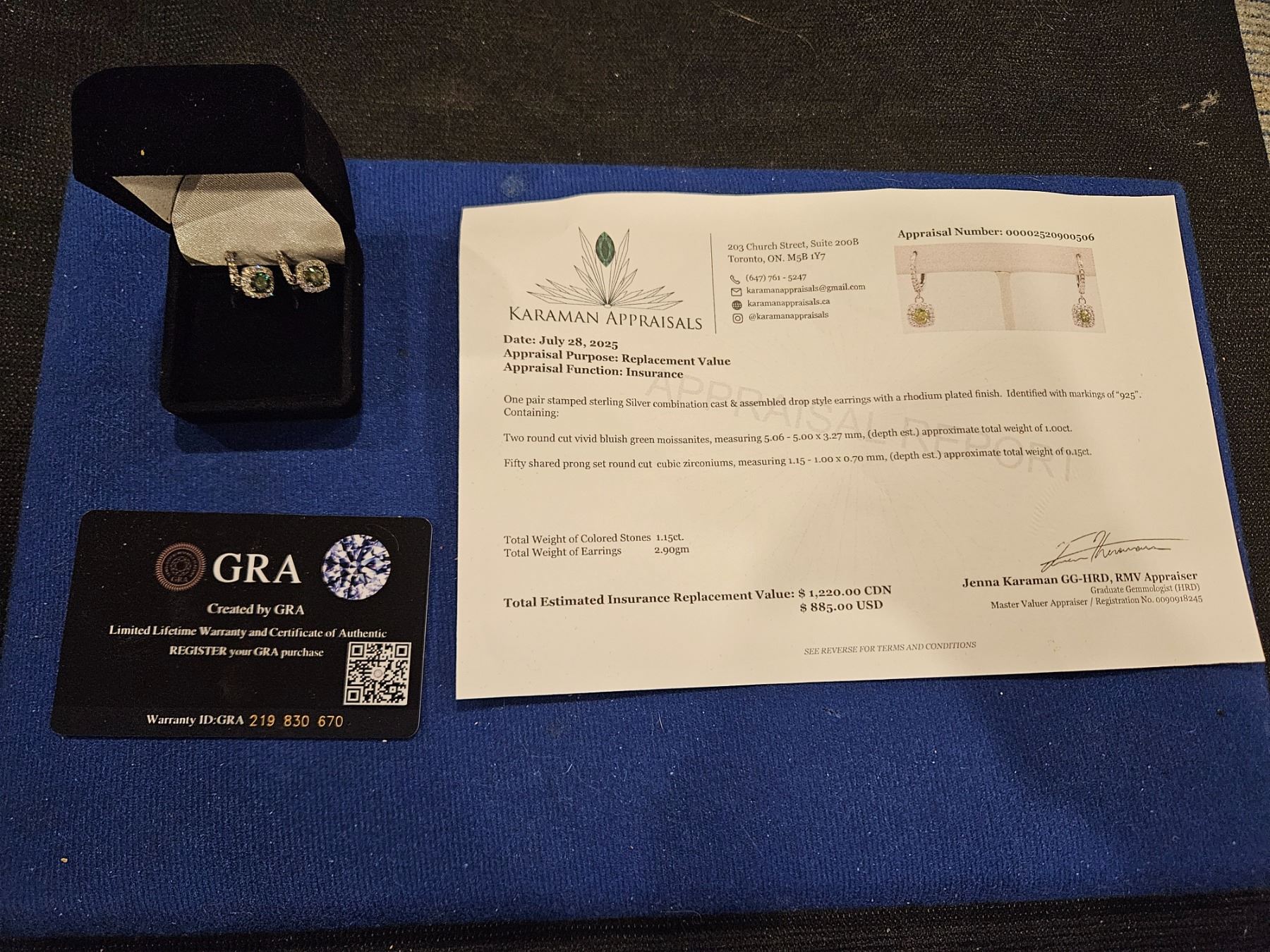1.00 CT TW GRA CERTIFIED ROUND BRILLIANT CUT MOISSANITE STONE VVS BLUISH GREEN COLOR WITH 50 ROUND BRILLIANT CUT CUBIC ZIRCONIA SET IN SQUARE HALOS WITH SOME SET IN CLASPS SET IN 925 SILVER EARRINGS RETAIL VALUE $1,220.00