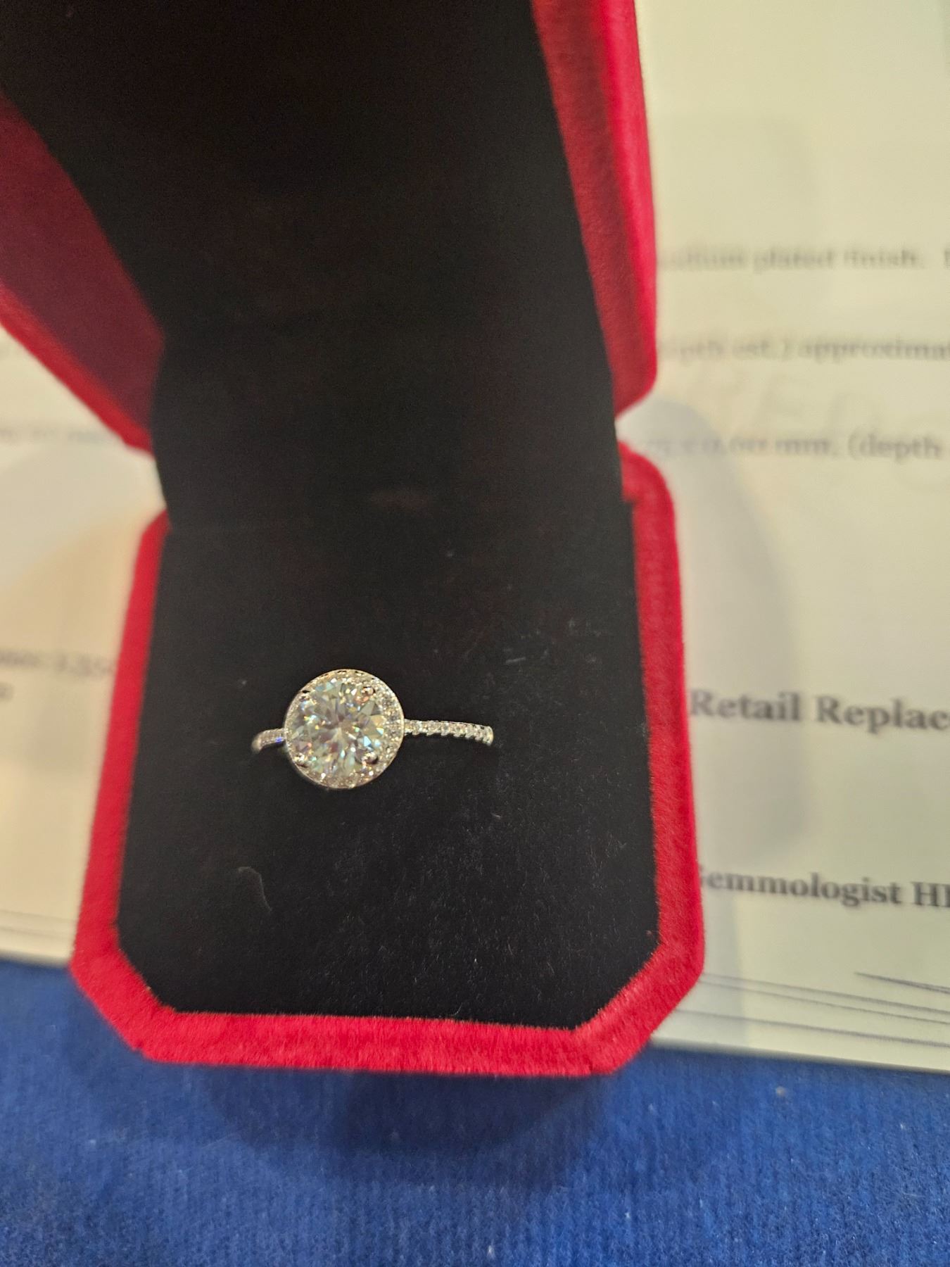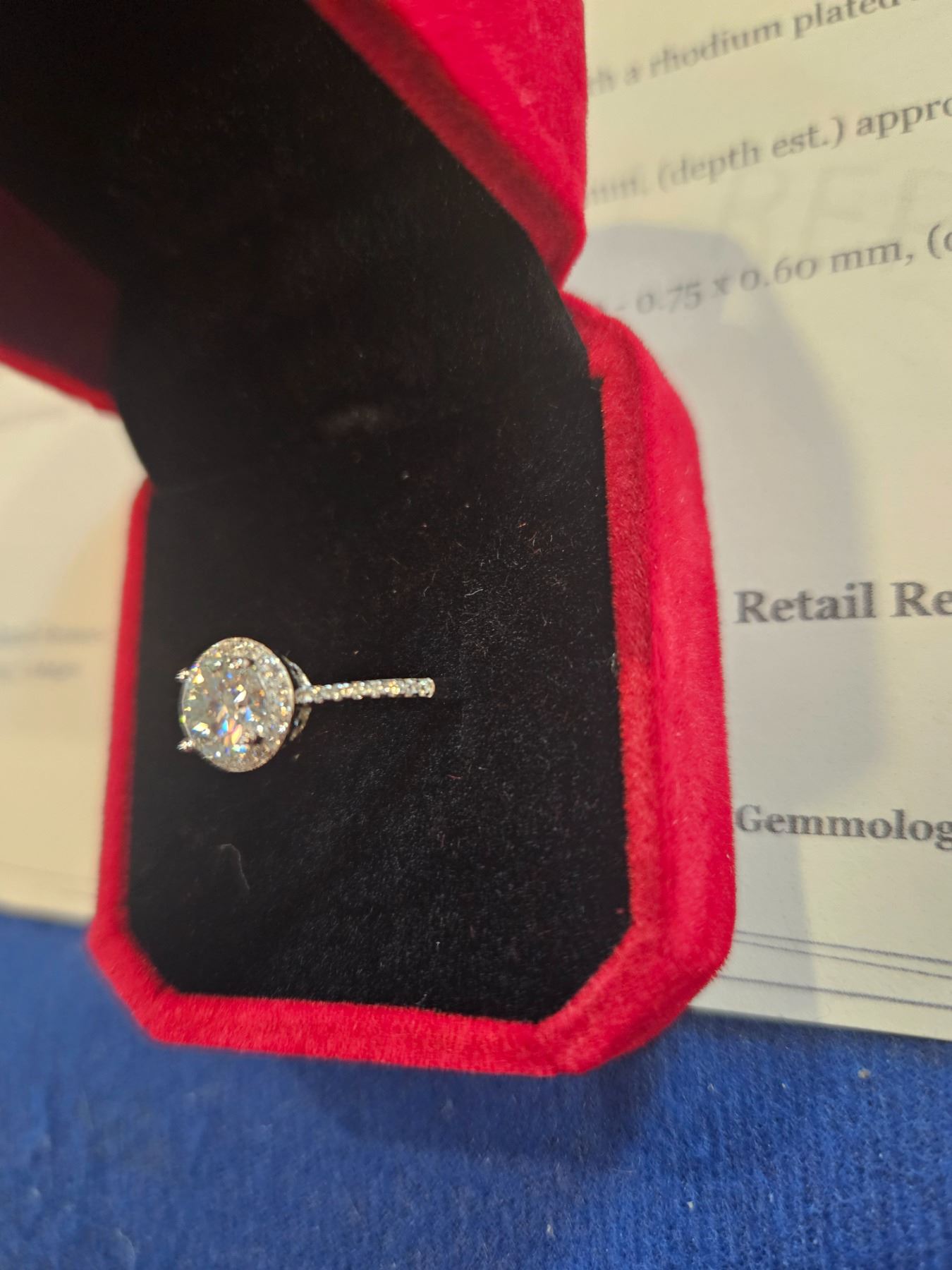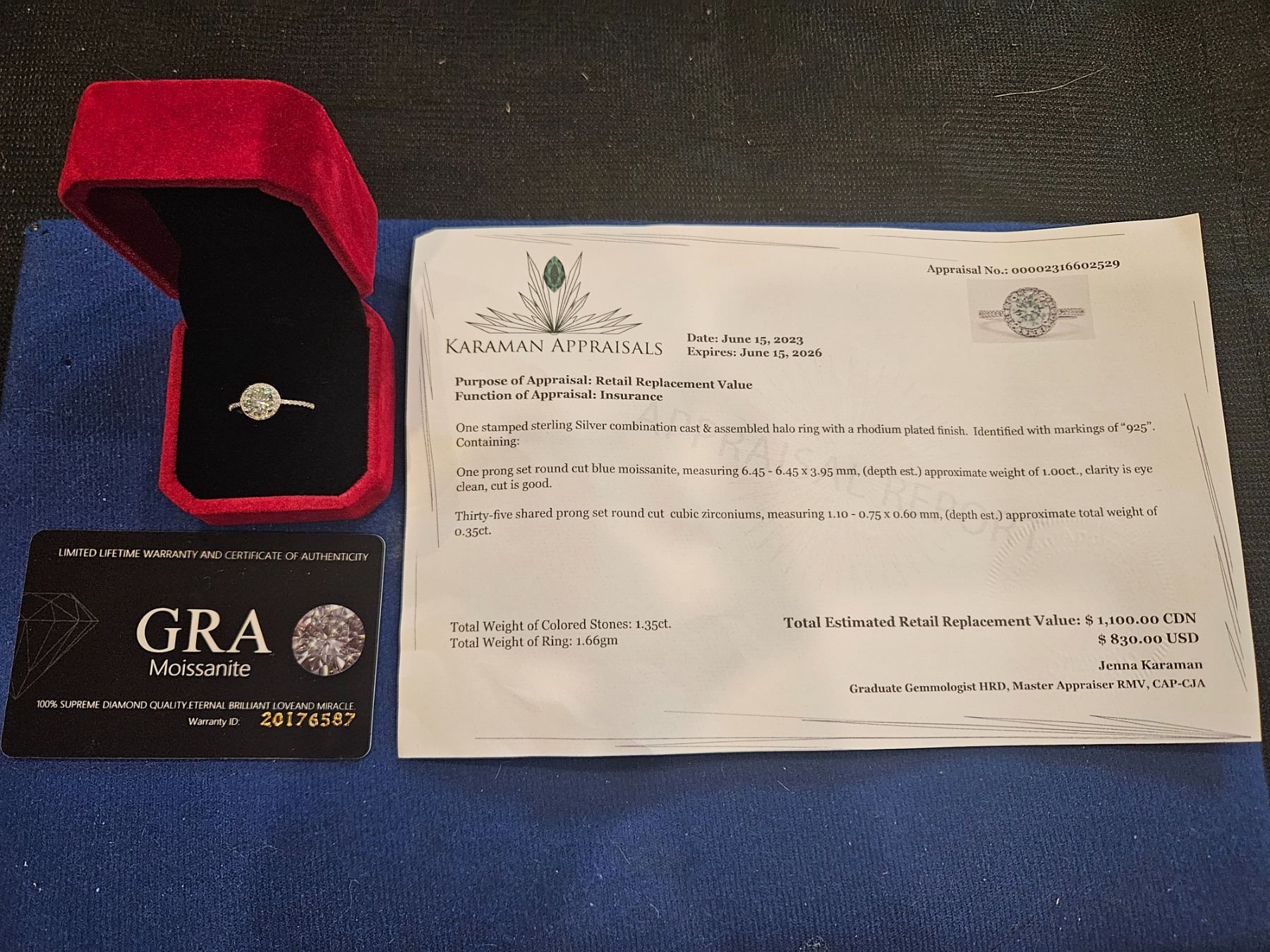 1.00 CT GRA CERTIFIED ROUND BRILLIANT CUT MOISSANITE STONE VVS D COLOR WITH 35 ROUND BRILLIANT CUT CUBIC ZIRCONIA SET IN ROUND SHAPED HALO AND IN SHANKS SET IN 925 SILVER RING SIZE ADJUSTABLE RETAIL VALUE $1,100.00