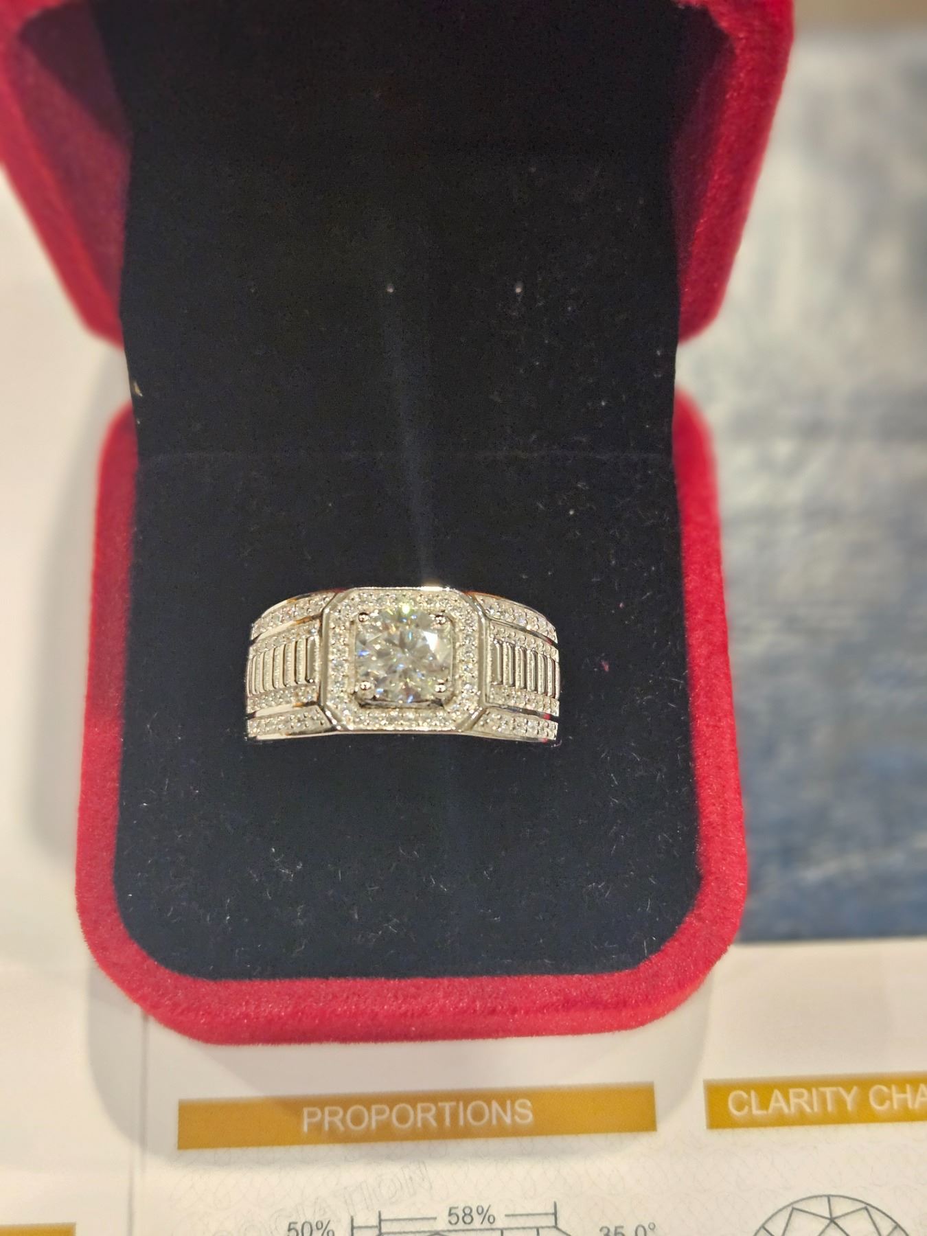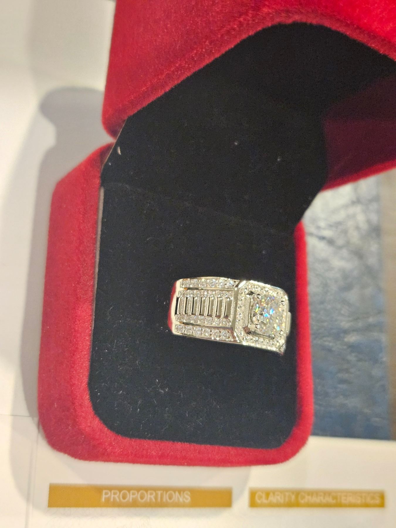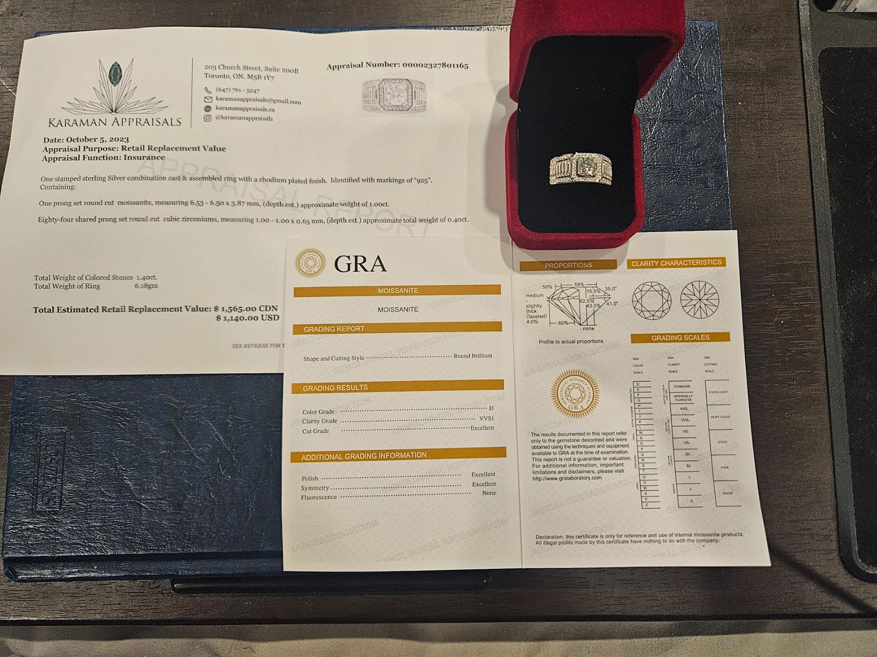 1.00 CT GRA CERTIFIED ROUND BRILLIANT CUT MOISSANITE STONE VVS D COLOR WITH 84 ROUND BRILLIANT CUT CUBIC ZIRCONIA SET IN SQUARE HALO AND IN 2X2 ROWS PER SHANK SET IN 925 SILVER RING SIZE 11 RETAIL VALUE $1,565.00