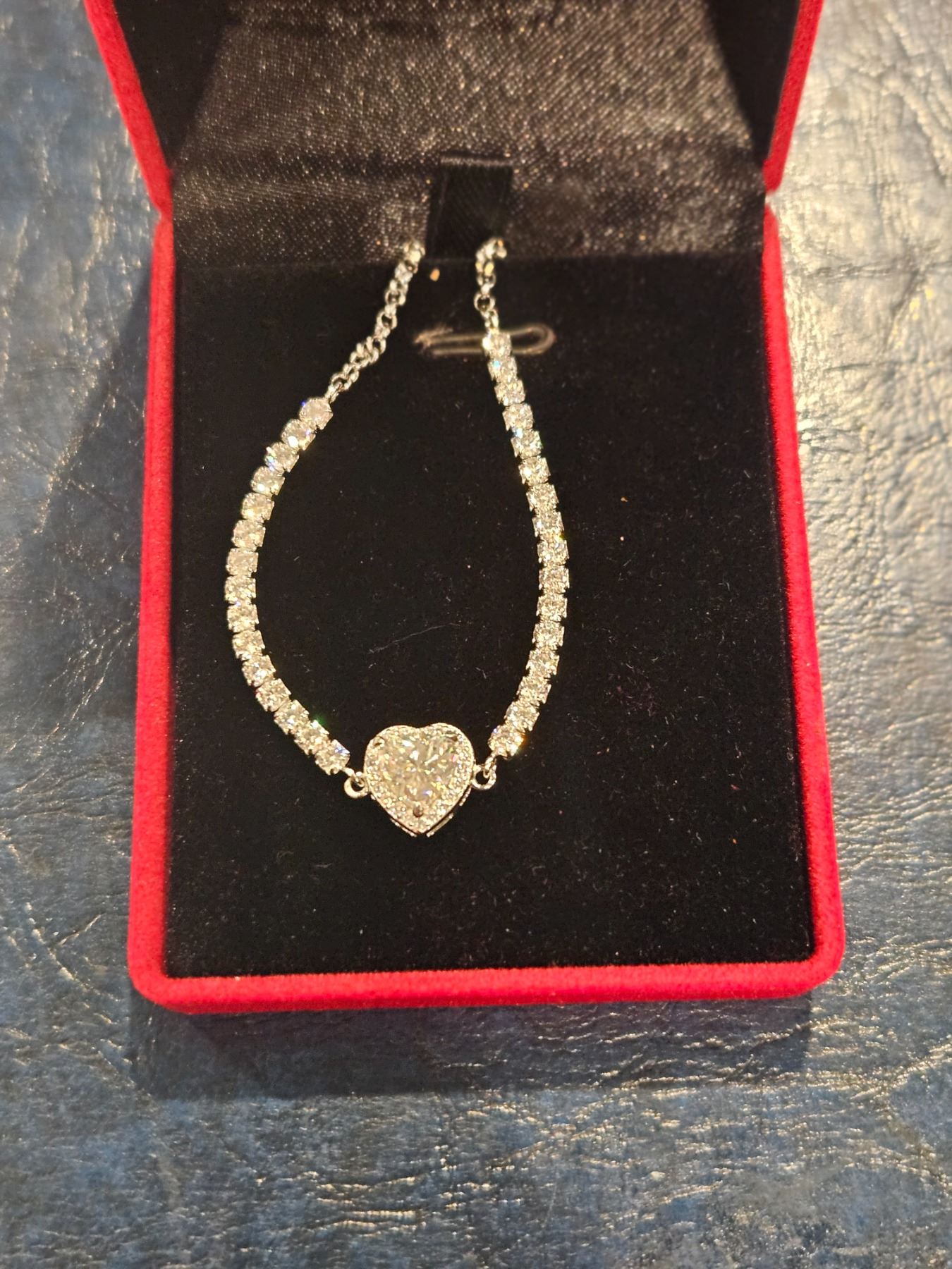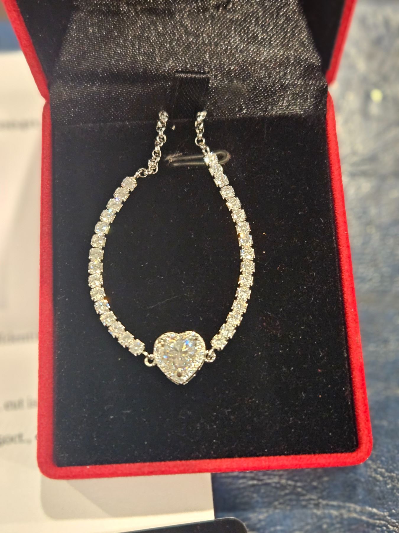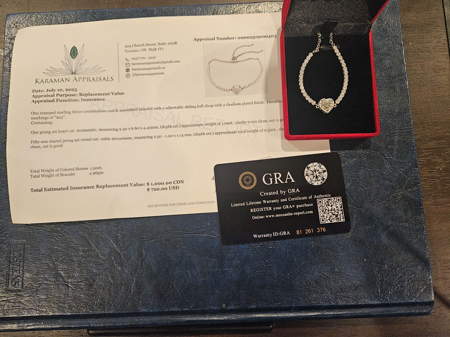 1.00 CT GRA CERTIFIED HEART BRILLIANT CUT MOISSANITE STONE VVS D STONE SET IN CENTER OF HEART SHAPED HALO WITH 51 ROUND BRILLIANT CUT CUBIC ZIRCONIA SET IN 4 CLAW HEADS IN BRACELET SET IN 925 SILVER BRACELET RETAIL VALUE $1,000.00