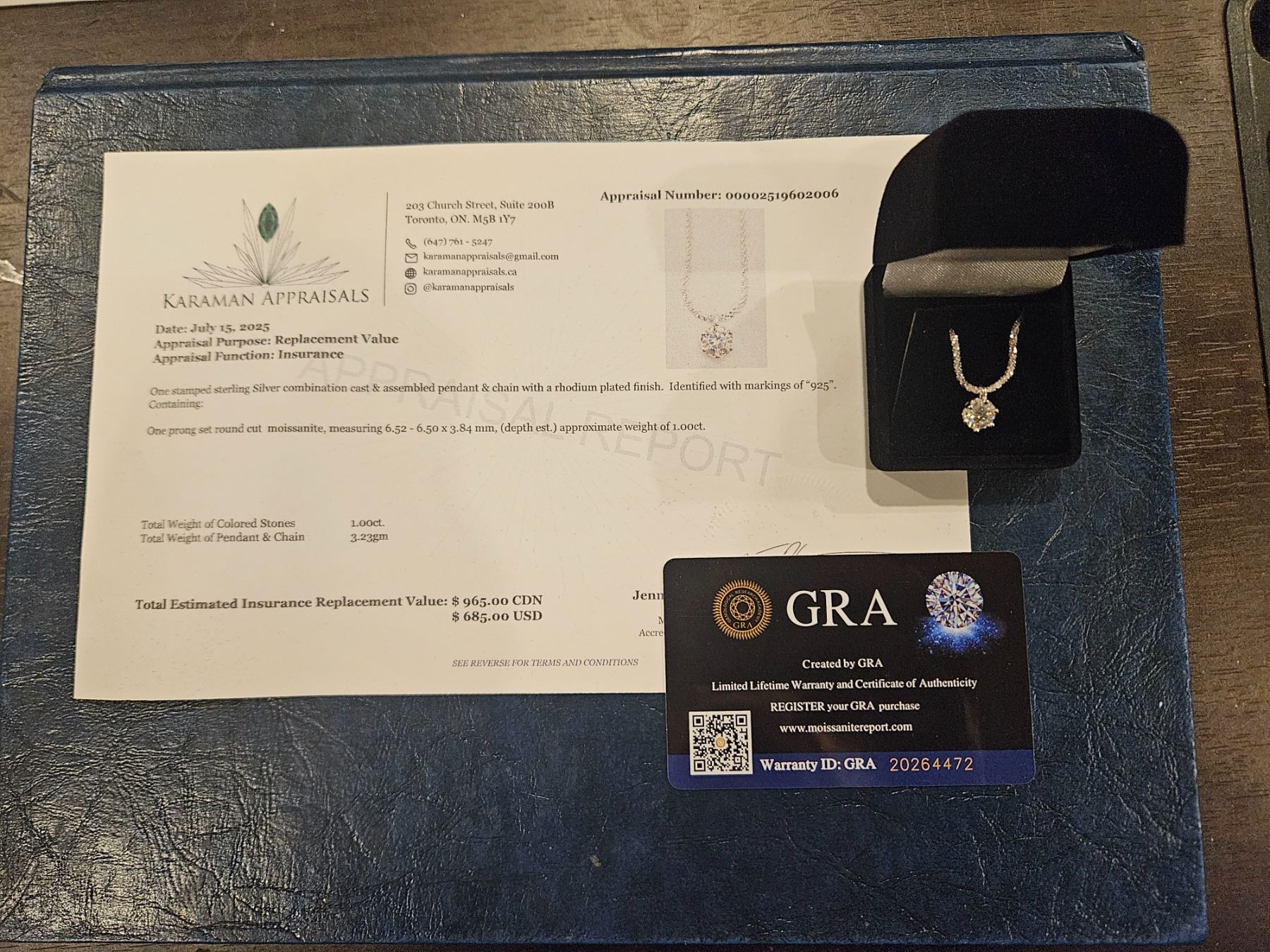 1.00 CT GRA CERTIFIED ROUND BRILLIANT CUT MOISSANITE STONE VVS D COLOR SET IN 925 SILVER PENDANT RETAIL VALUE $965.00