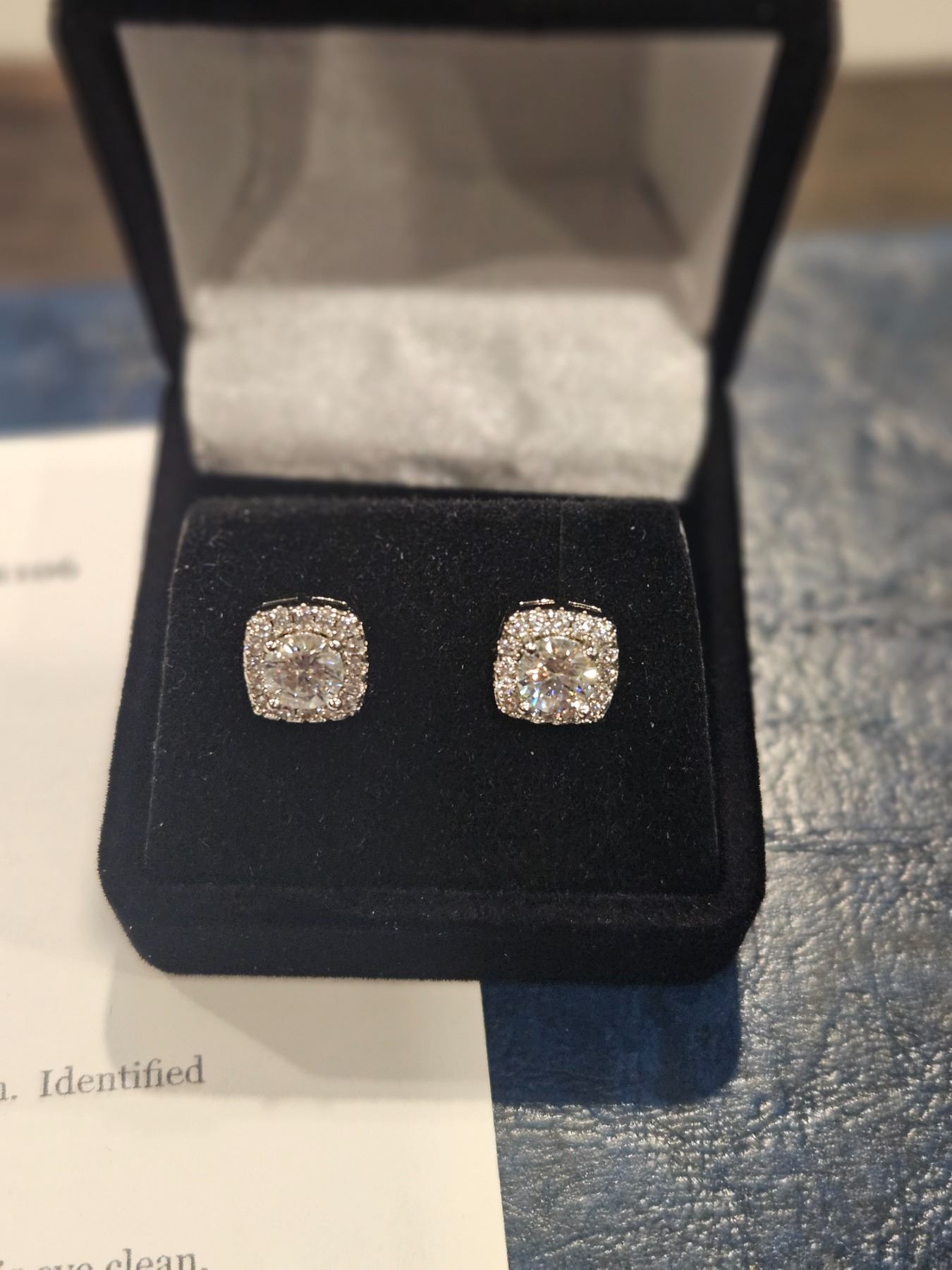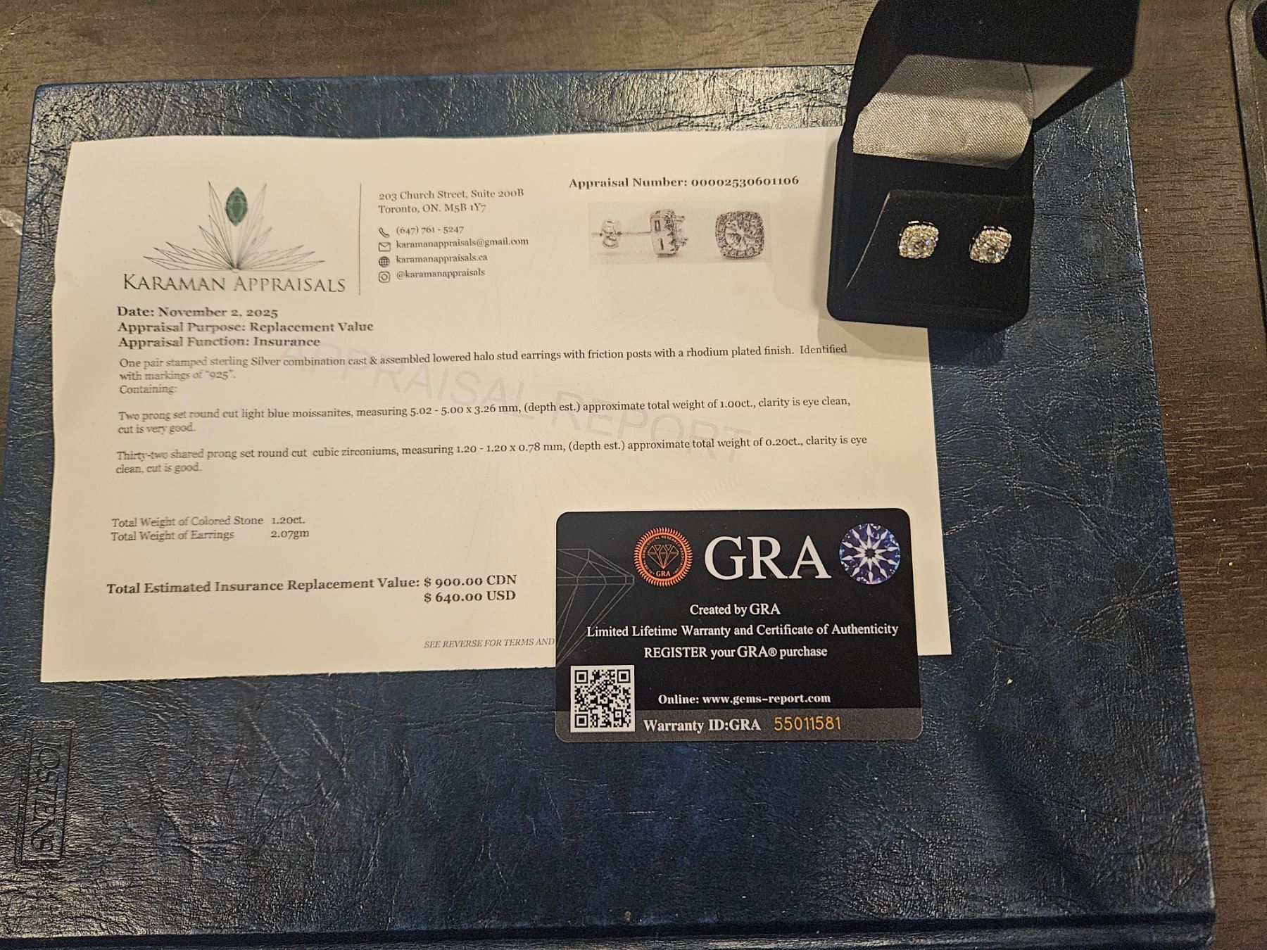 1.00 CT TW GRA CERTIFIED ROUND BRILLIANT CUT MOISSANITE STONES VVS D COLOR WITH 32 ROUND BRILLIANT CUT CUBIC ZIRCONIA SET IN SQUARE SHAPED HALOS SET IN 925 SILVER EARRINGS RETAIL VALUE $900.00