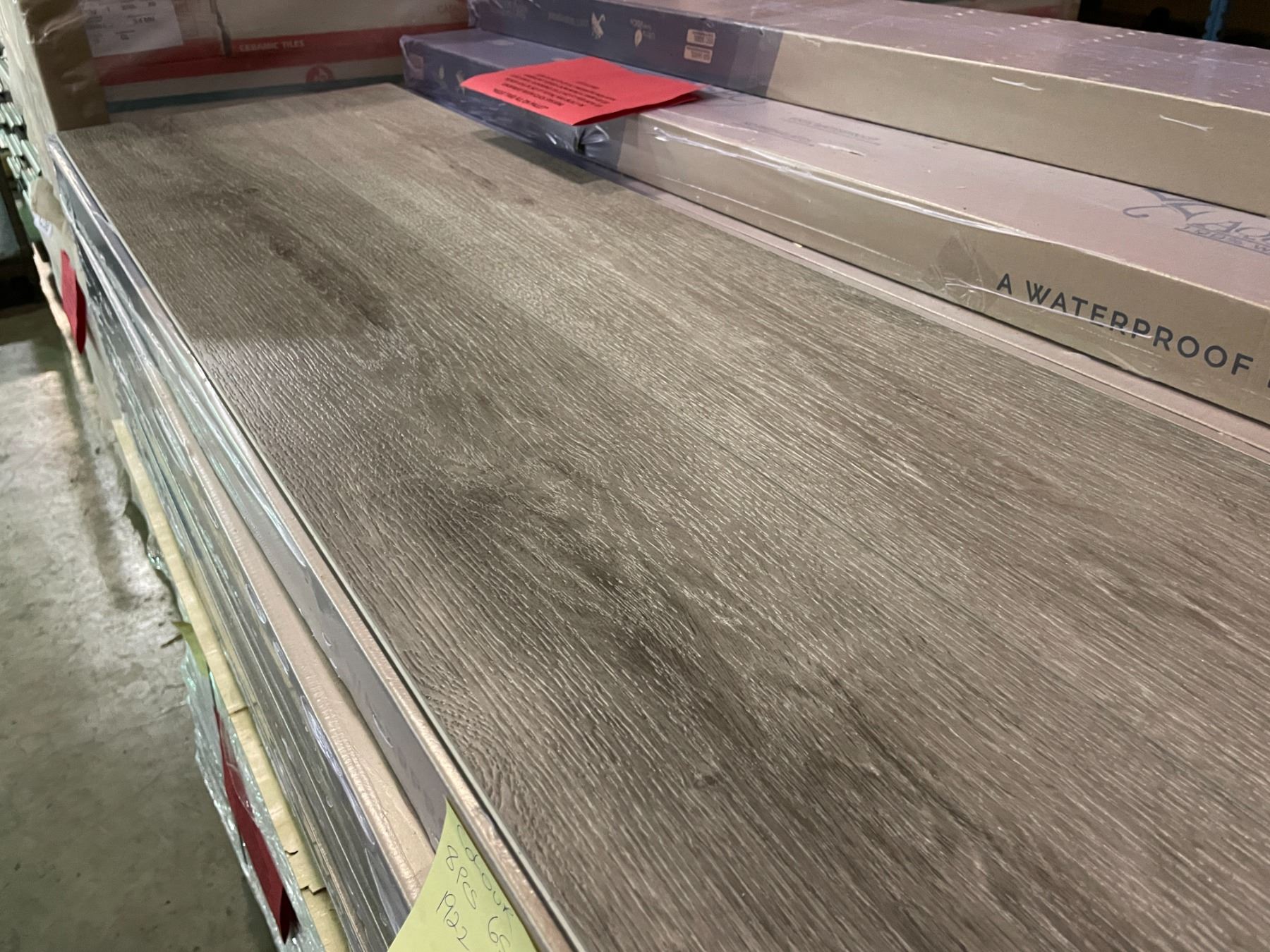 1,057.1 SQ FT OF EC PREMIUM AQUAFIX HARMONY SERIES DOWNING 6.5MM GLUE LESS VINYL FLOORING 19.22 SQ FT PER BOX 55 BOXES 1,057.1 SQ FT TOTAL HAS BUILT IN UNDERLAY WITH CLICK SYSTEM, *MUST TAKE ALL ON PALLET*