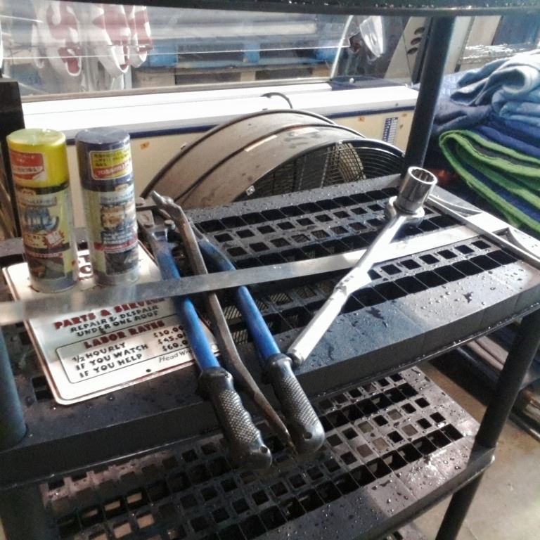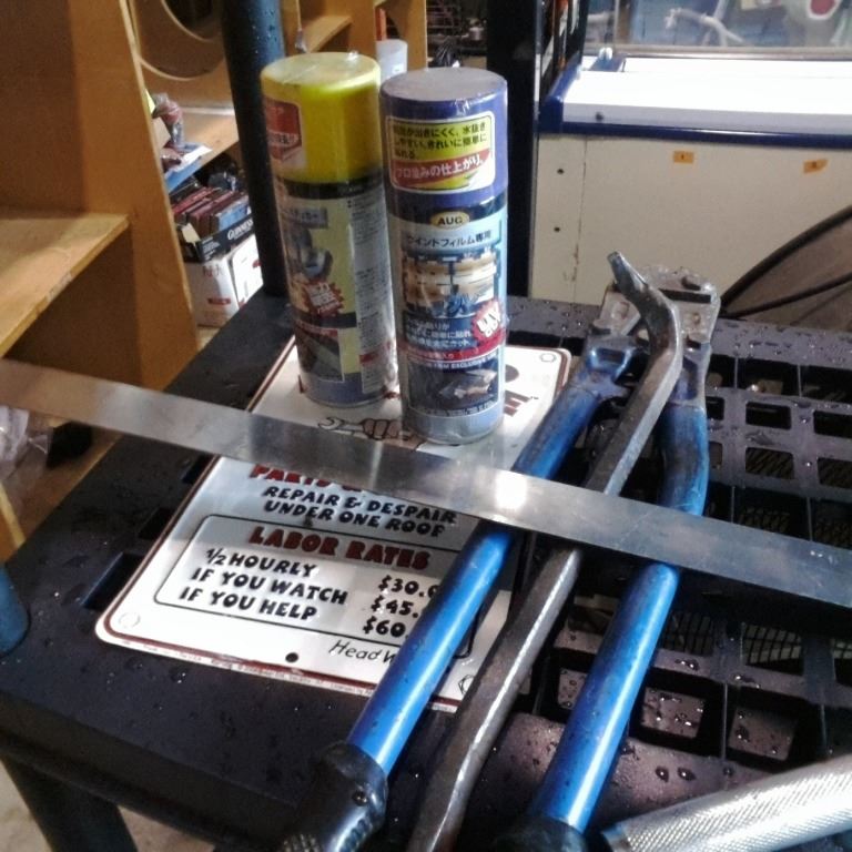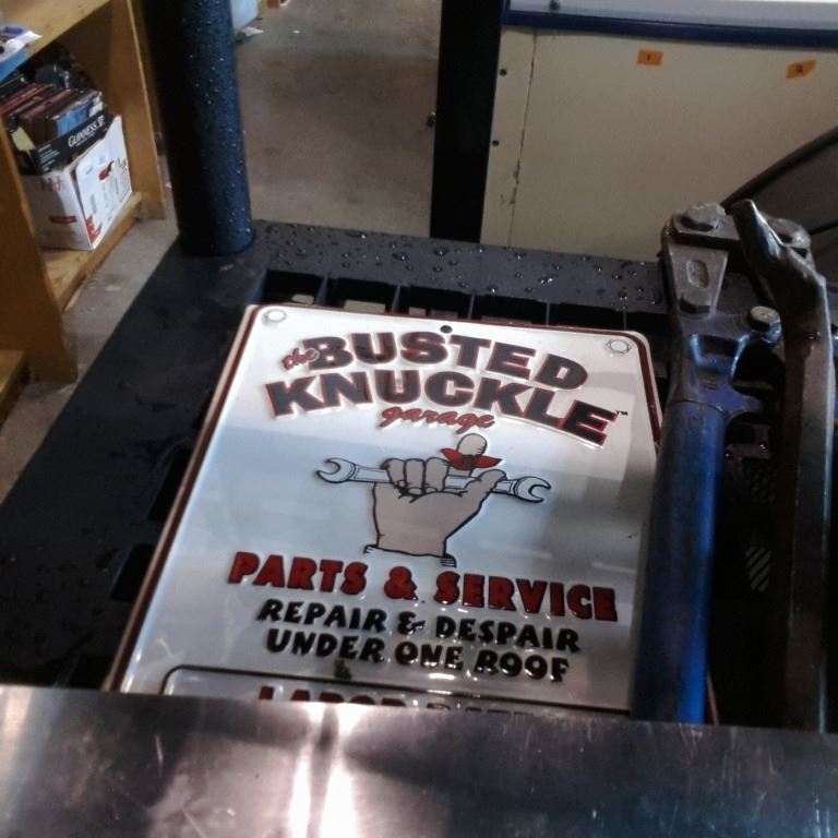 1-1/2 INCH SOCKET AND WRENCH, BOLT CUTTER, CROWBAR AND SQUARE, TIN SIGN AND SPRAYS