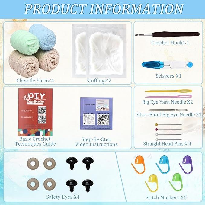 - Crochet Kit for Beginners Adults 2 Pack Crochet Turtle Kit Crochet Animal Starter Kits with Step-by-Step Video Tutorials,DIY Complete Knitting Supplies Beginner Friendly Chenille Yarn Craft Gifts