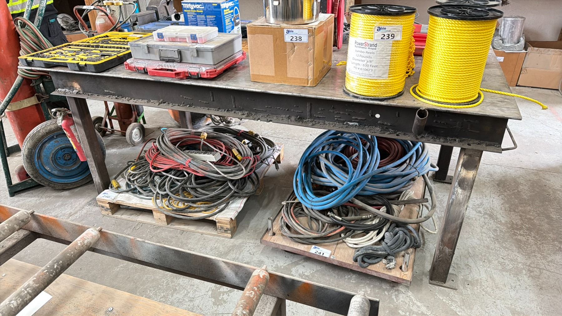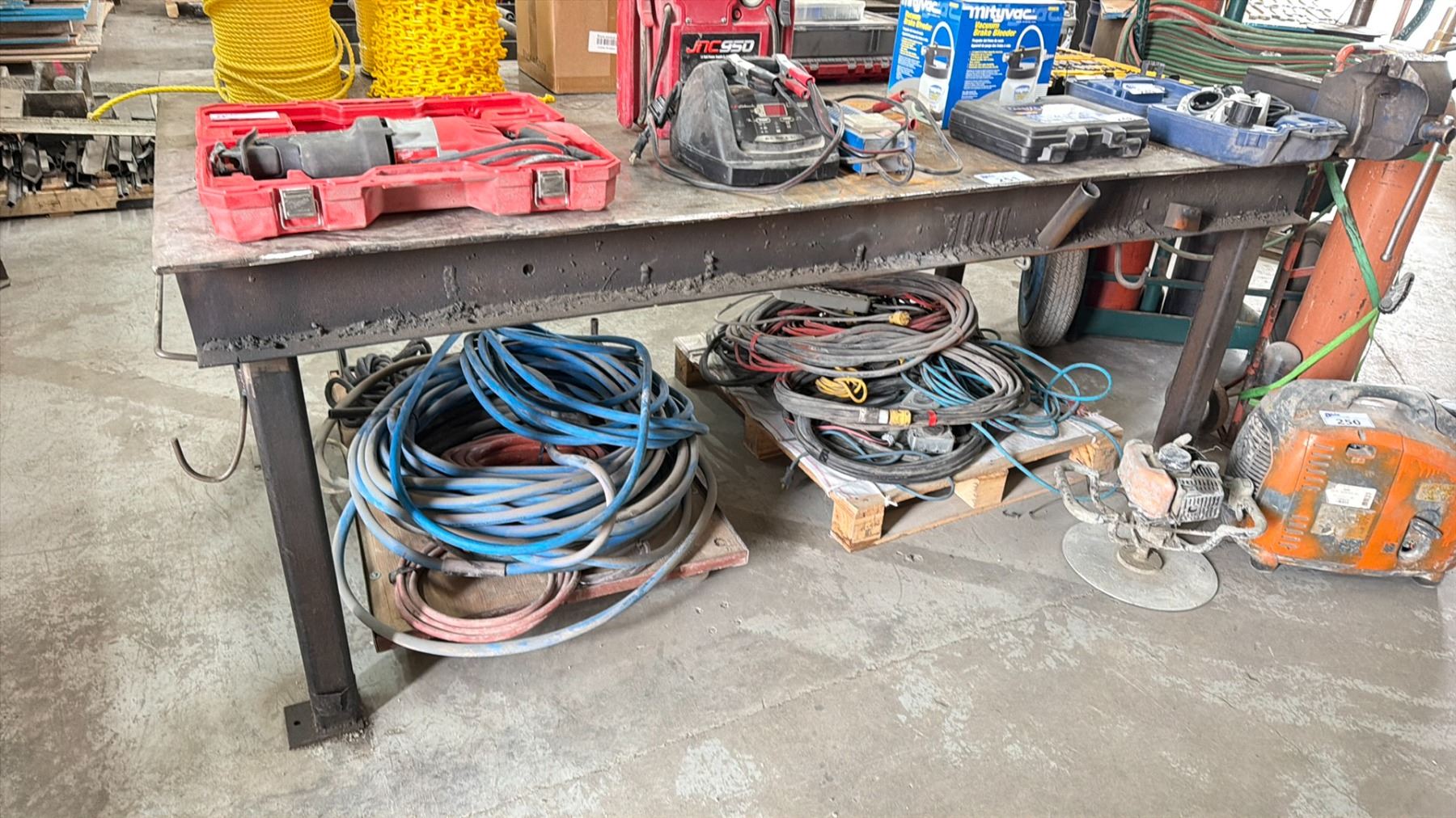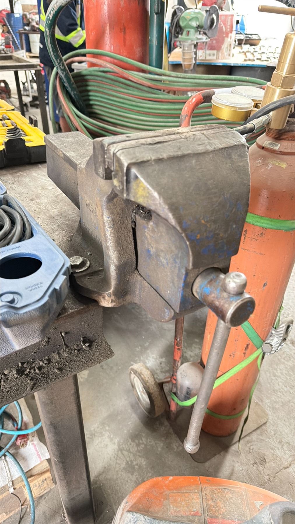 1/2" THICK TOP STEEL WORK TABLE W/RECORD MECHANICS VISE - APPROX. 8FT ACROSS X 4FT WIDE X 3FT HIGH