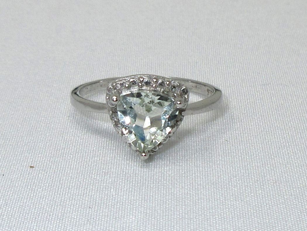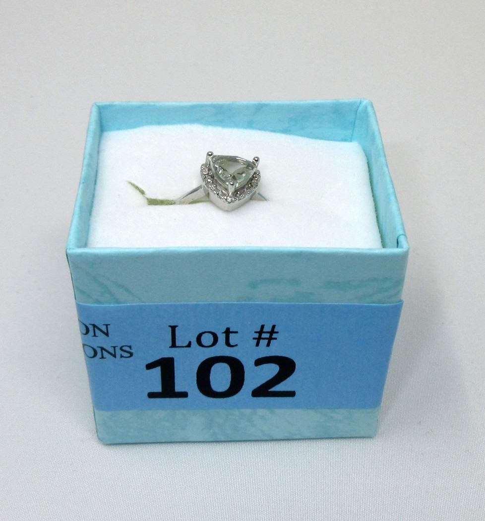 Sterling silver. Trillion cut amethyst with 2 shoulder diamonds. Includes $350 certificate.