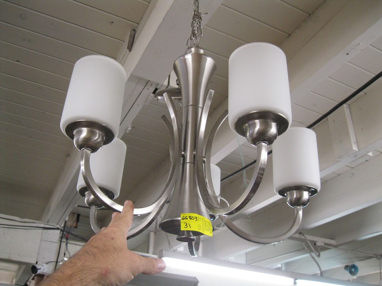 1 5 LIGHT STAINLESS CHANDELIER W/WHITE GLASS COVERS