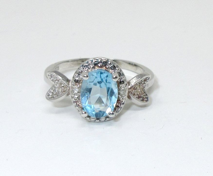 Oval cut topaz with 2 side diamonds, set in sterling silver. Includes $325 certificate.