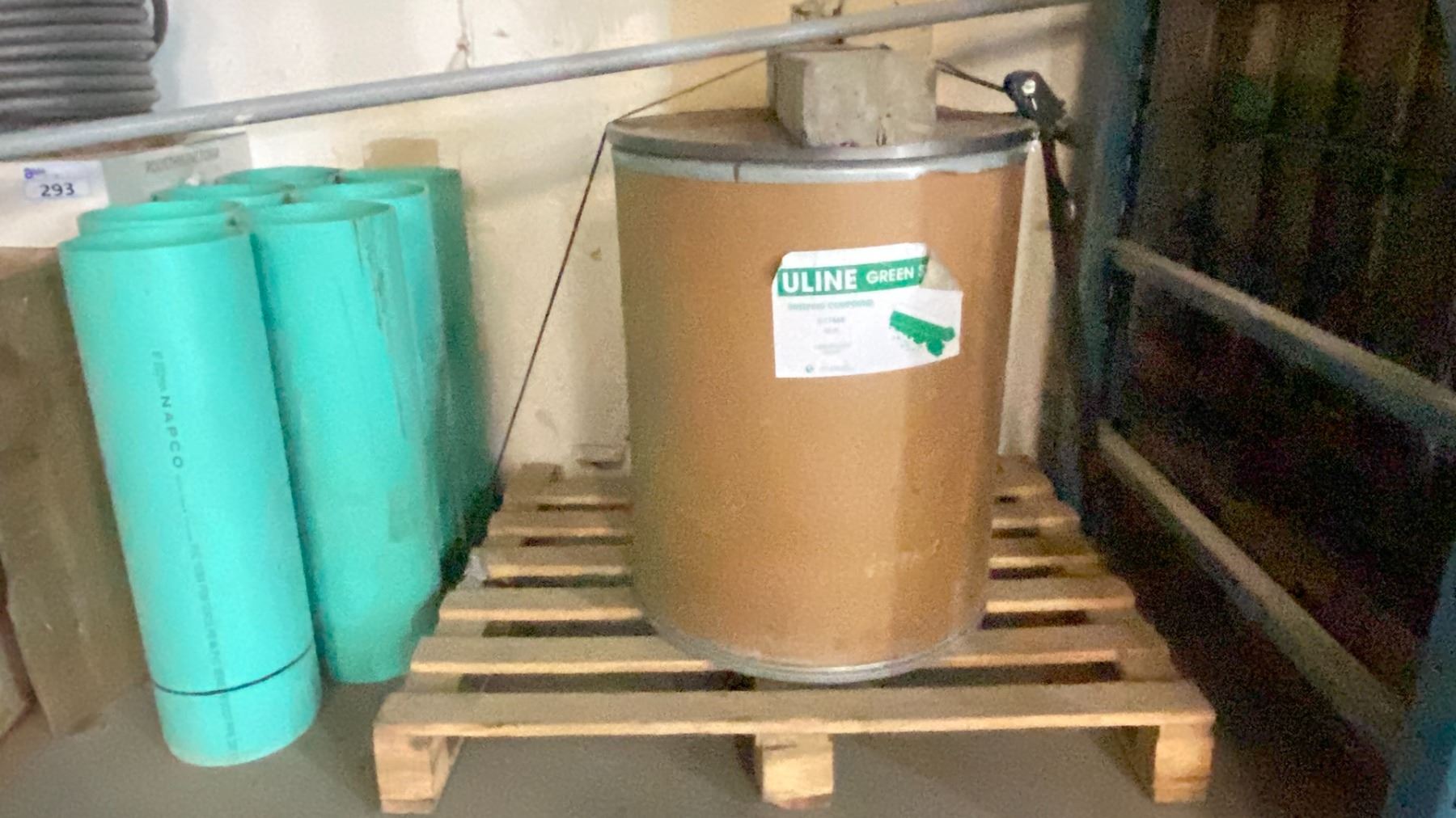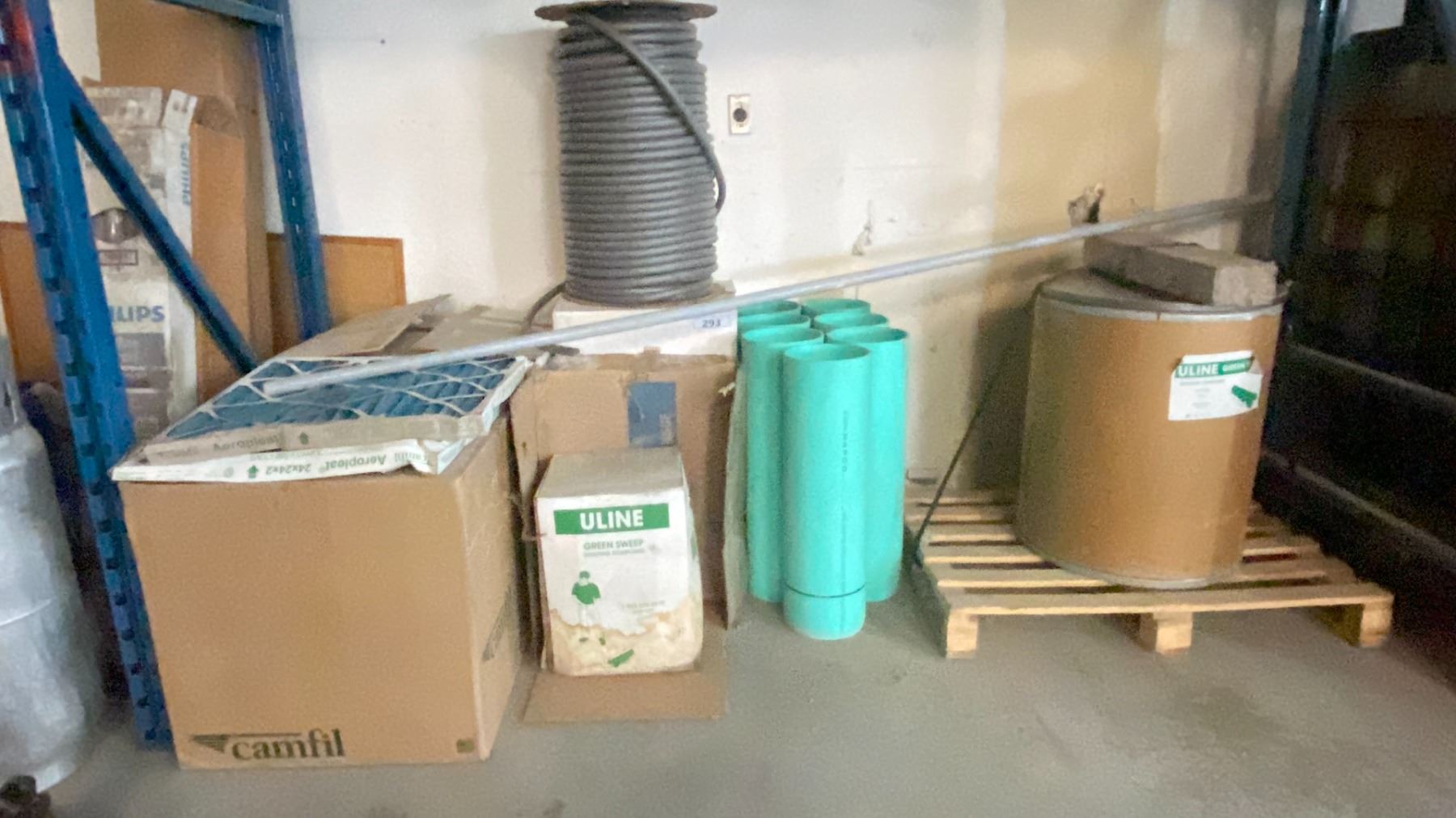 1 BARREL OF ULINE GREEN SWEEP SWEEPING COMPOUND, AEROPLEAT AIR FILTERS, 8" PVC PIPE PIECES & MORE