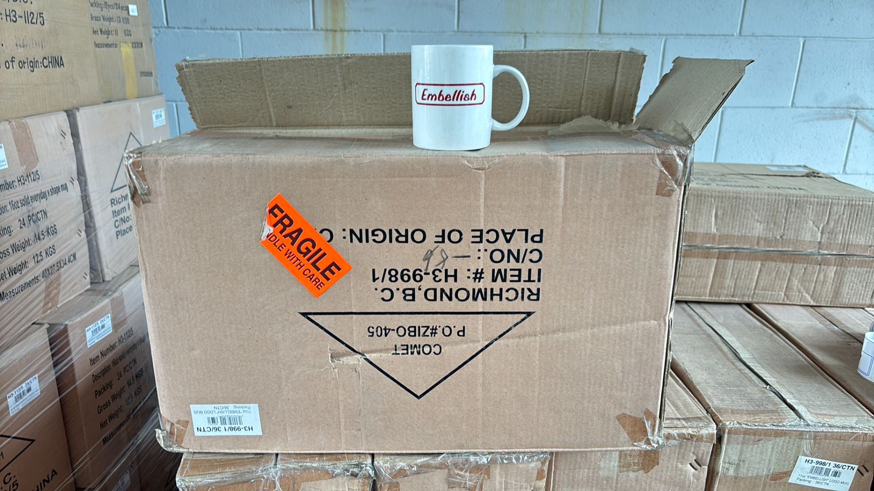 1 CASE OF 11OZ "EMBELLISH" LOGO MUGS ( 36 PER CASE )