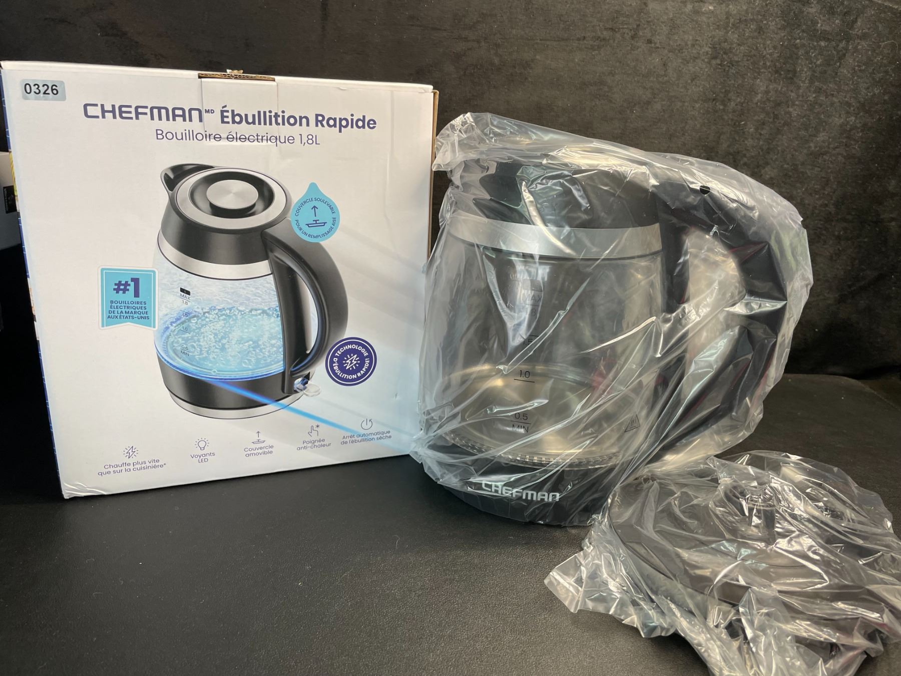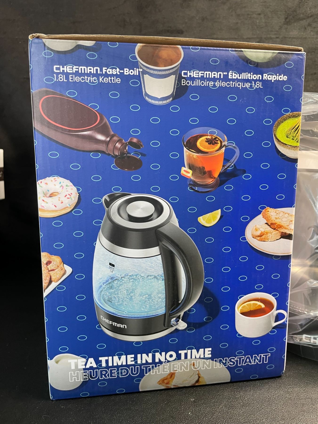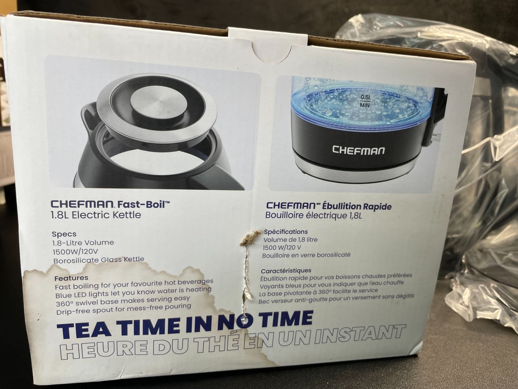 - Chefman Electric Kettle, 1.8L 1500W, Hot Water Boiler, Removable Lid for Easy Cleaning, Auto Shut Off, Boil-Dry Protection, Stainless Steel Filter, BPA Free, Borosilicate Glass Electric Tea Kettle