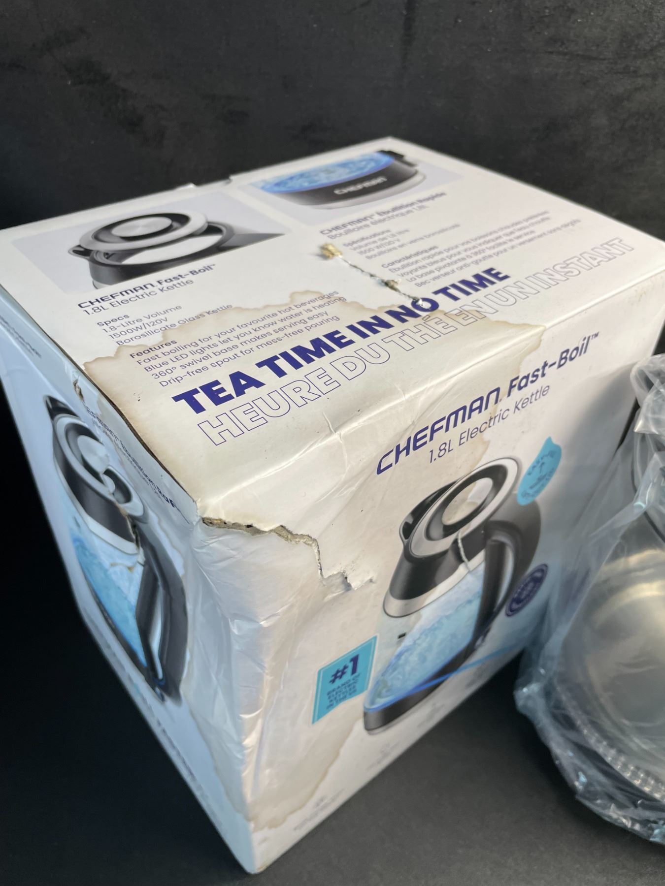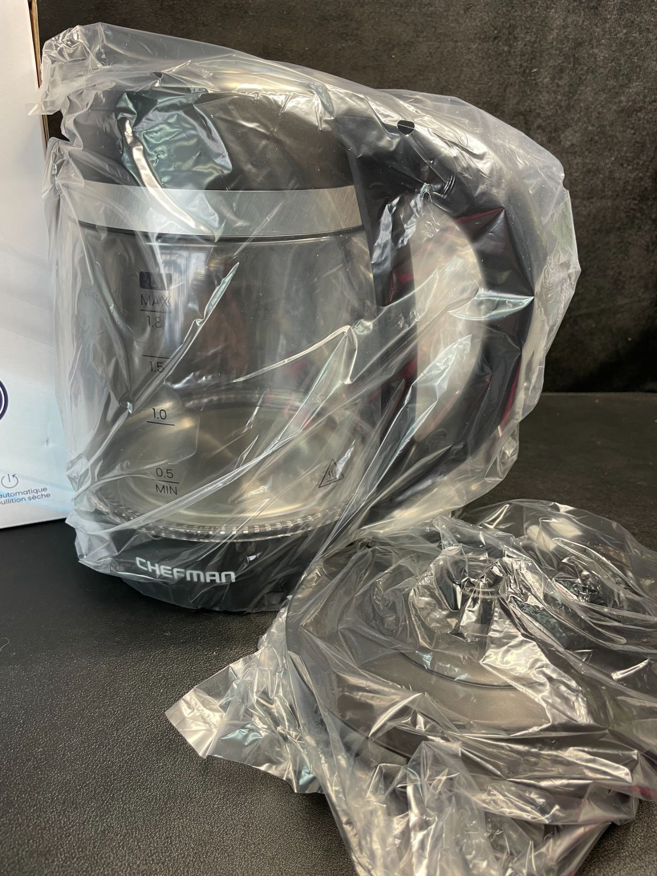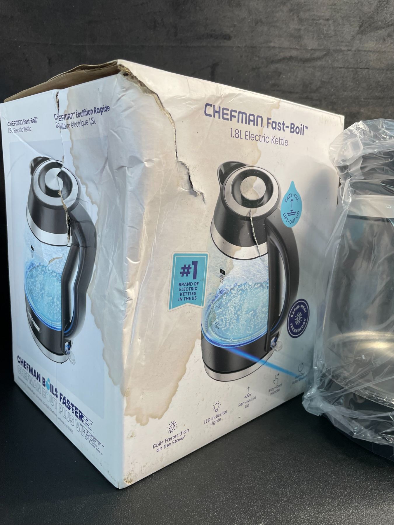 - Chefman Electric Kettle, 1.8L 1500W, Hot Water Boiler, Removable Lid for Easy Cleaning, Auto Shut Off, Boil-Dry Protection, Stainless Steel Filter, BPA Free, Borosilicate Glass Electric Tea Kettle