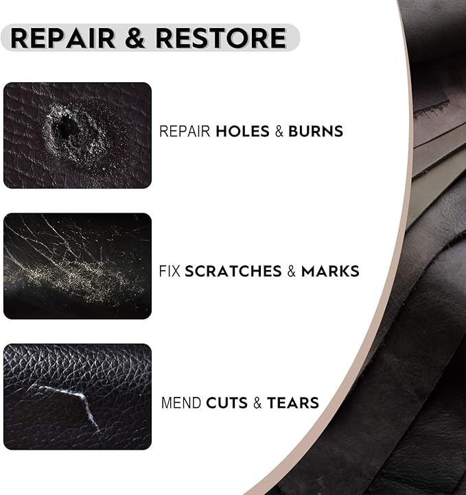 - Leather Repair Kit for Couches, Vinyl Repair Kit for Furniture, Car Seats, Sofa, Jacket, Purse, Belt, Shoes, Boat - Scratch Filler Leather Care DIY Leather Fix Kit Repairs Tears Burn Holes - Black