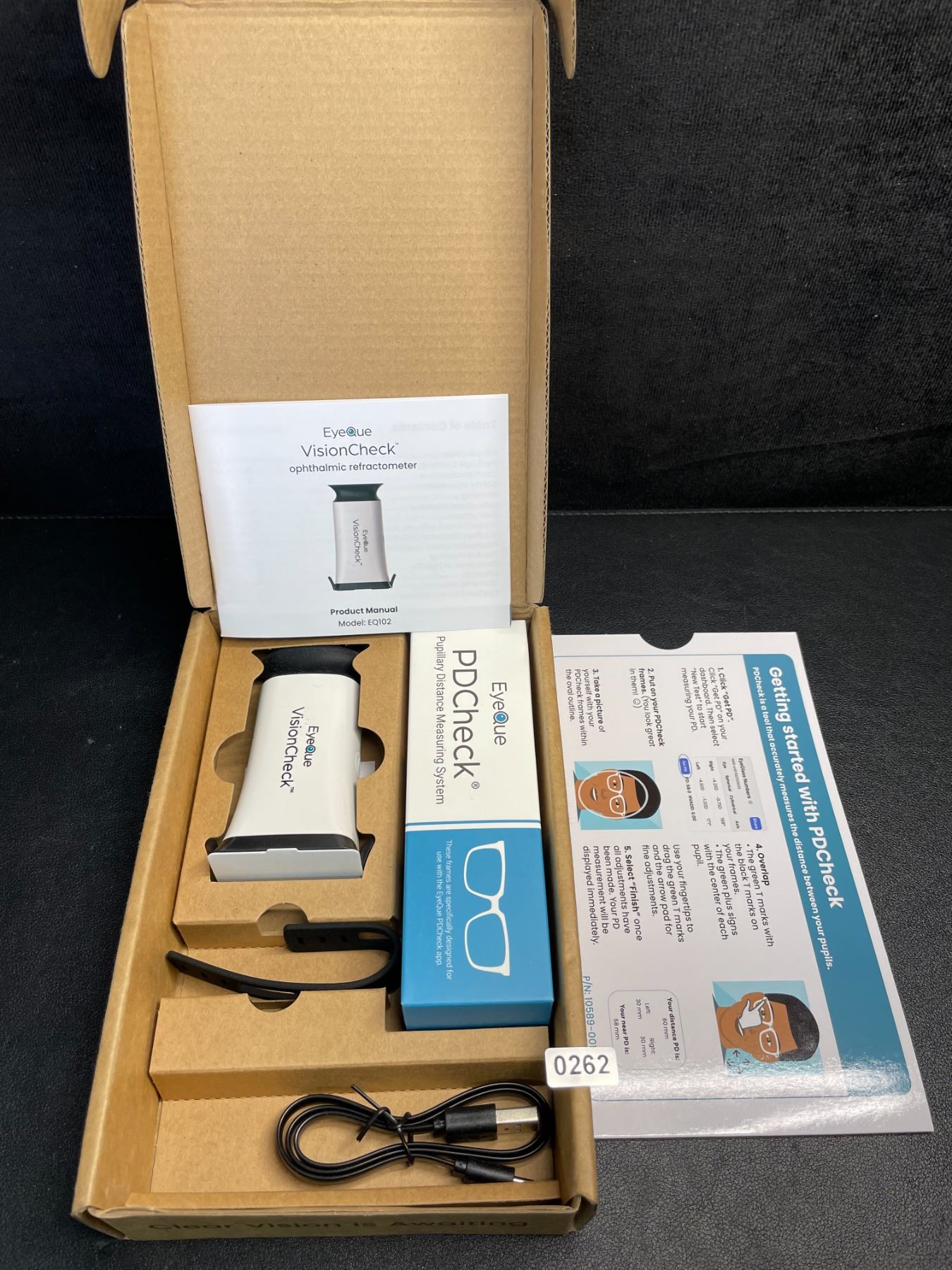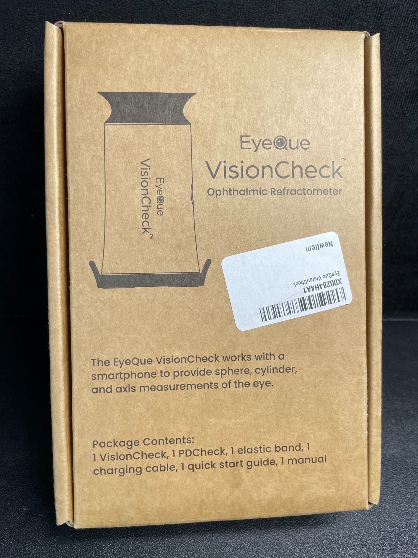 - The EyeQue VisionCheck works with a smartphone to provide sphere, cylinder, and axis measurements of the eye
