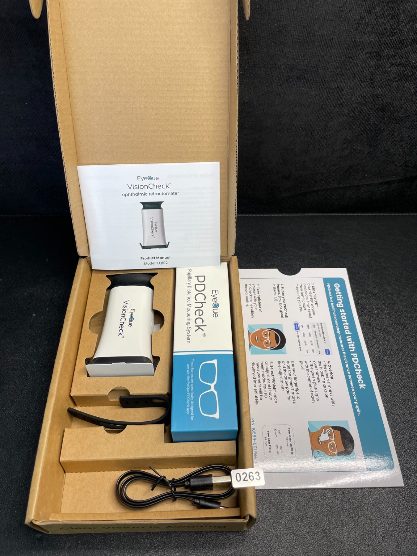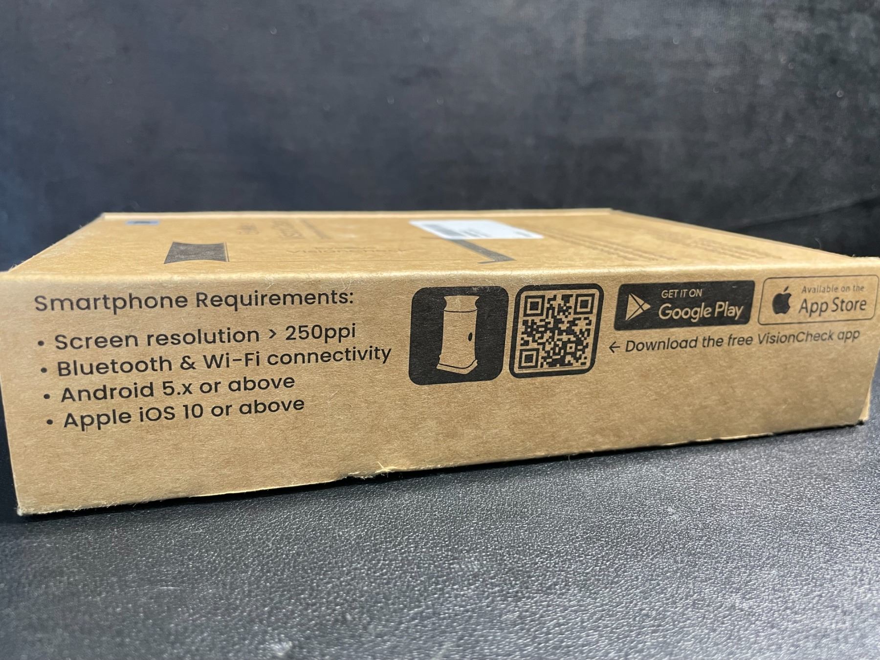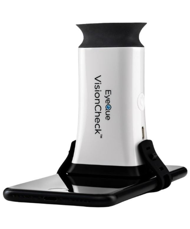 - The EyeQue VisionCheck works with a smartphone to provide sphere, cylinder, and axis measurements of the eye