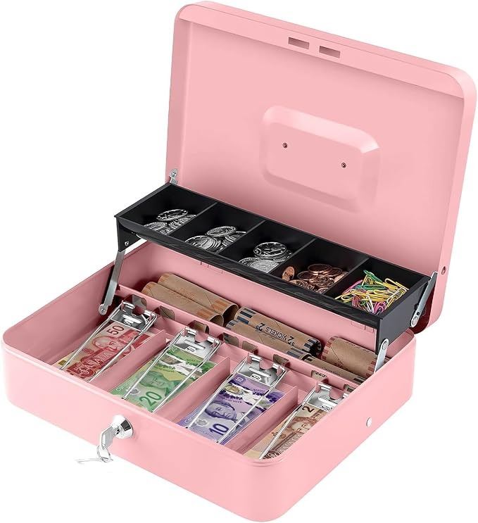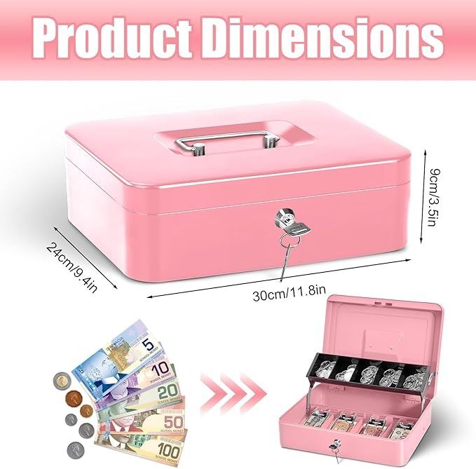 - Metal Cash Box, Money Lock Box, Portable Money Box for Storing Bills, Coins, Checks and Receipts (Pink)