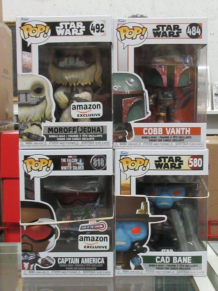 Star Wars #492 Moroff (Jedha), Star Wars #580 Cad Bane, Star Wars #484 Cobb Vanth, and Marvel #818 Captain America.