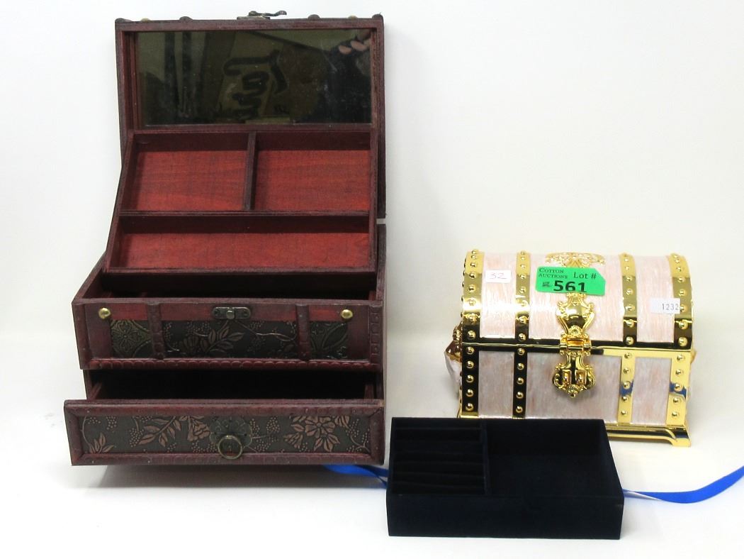 Pink enamel cask with removable tray is 5" x 7" x 5" tall. Wood with drawer and removable tray is 6" x 9" x 6" tall