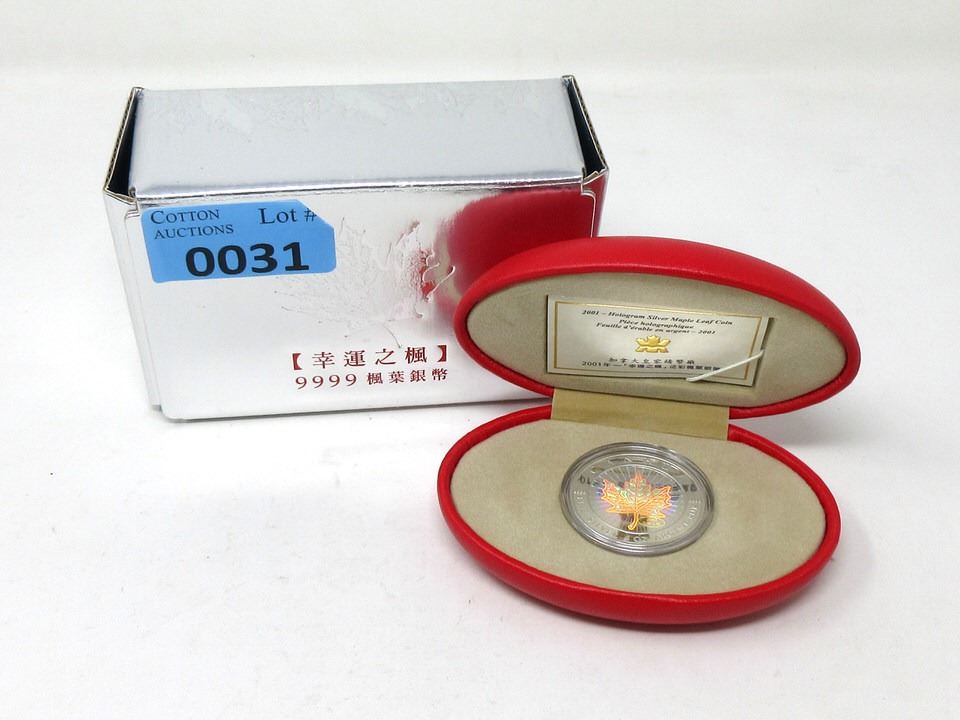 "Hologram Silver Maple Leaf Coin". In red oval RCM box and silver coloured box. With RCM certificate. Tax exempt
