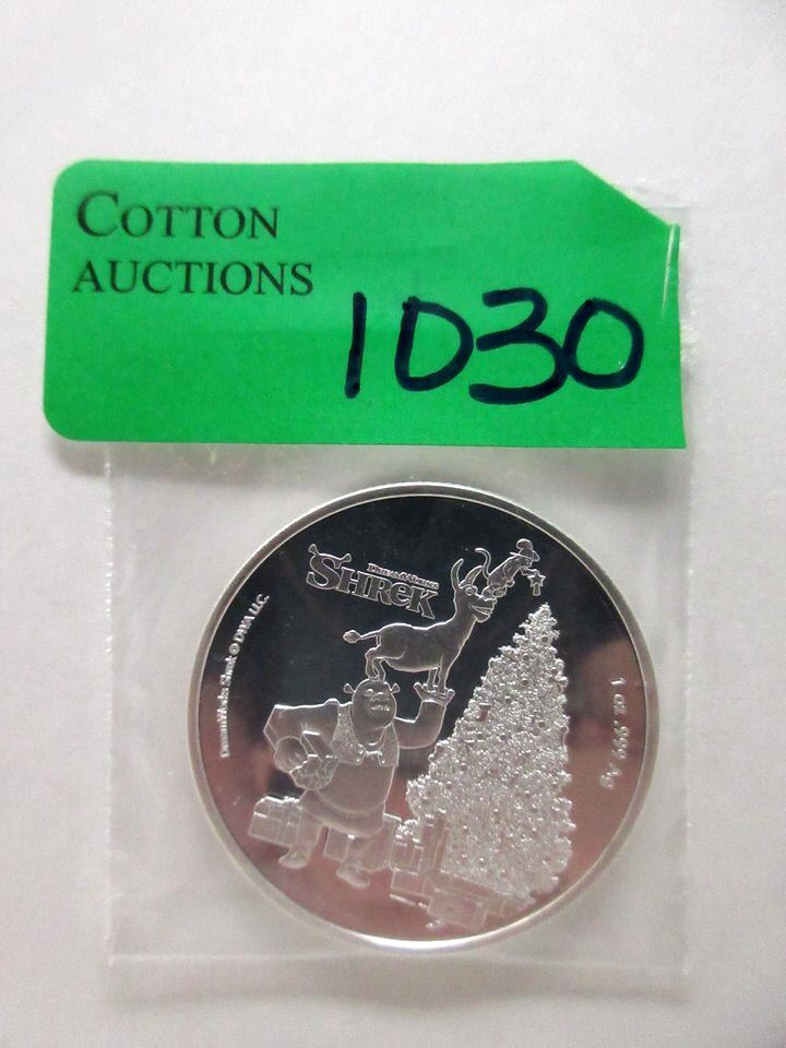 Officially licensed by ©DreamWorks. Mintage: 10,000. Depicts Shrek, Donkey and Puss in Boots decorating a Christmas tree. Tax exempt.