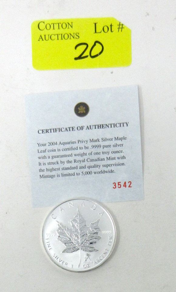 1 Oz .9999 Silver Aquarius Privy Maple Leaf Coin