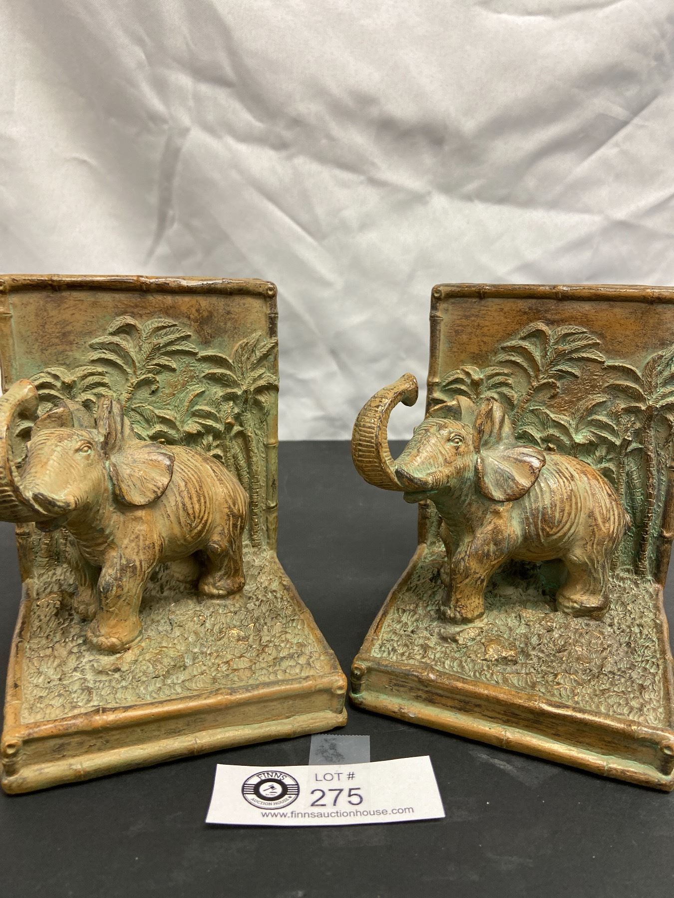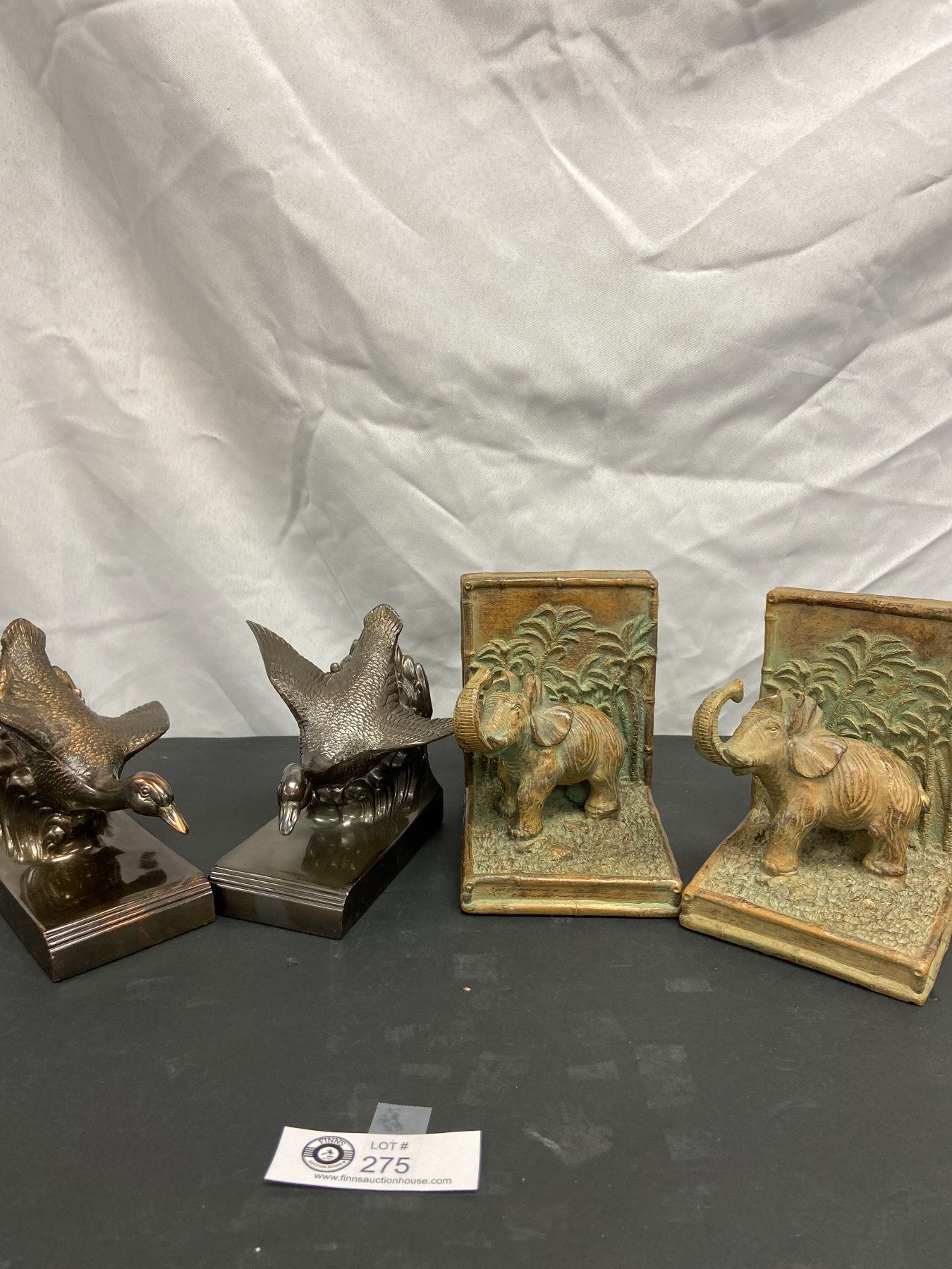 1 Pair of Heavy Vintage PMC Metal Bookends and 1 Pair of Bronze Looking Heavy Elephant Bookends with Palm Trees in Background.