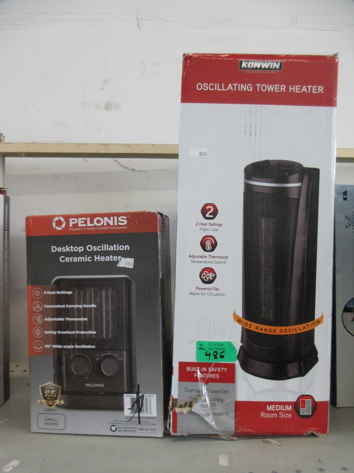 Pelonis desktop oscillating desktop heater and Konwin oscillating tower heater. Customer return. As is.