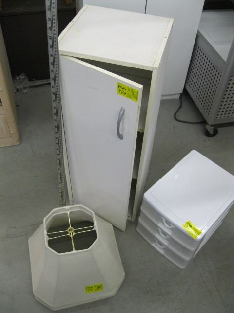 1 SMALL WHITE CABINET, 2 LAMP SHADES, SMALL 3 DRAWER PLASTIC STORAGE BIN
