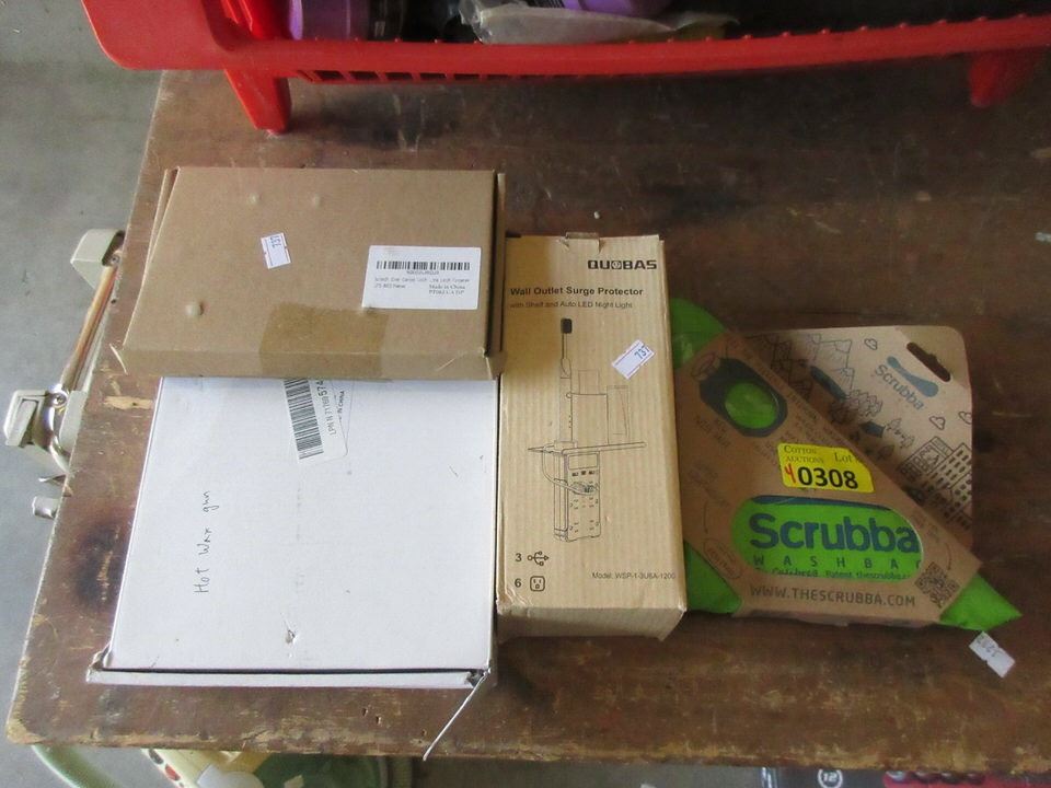 Wall outlet surge protector, hot glue gun, box of latching fasteners.