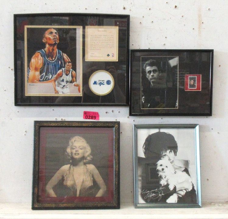 Anfernee Hardaway, James Dean photo with stamp, and 2 copies of Marilyn Monroe and Elizabeth Taylor photos. Largest is 14" x 12".