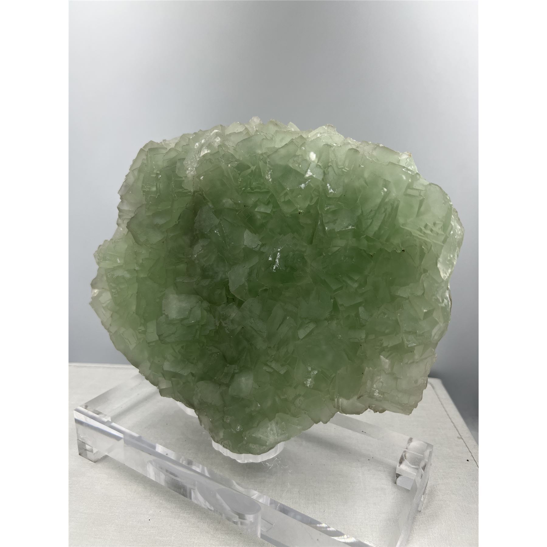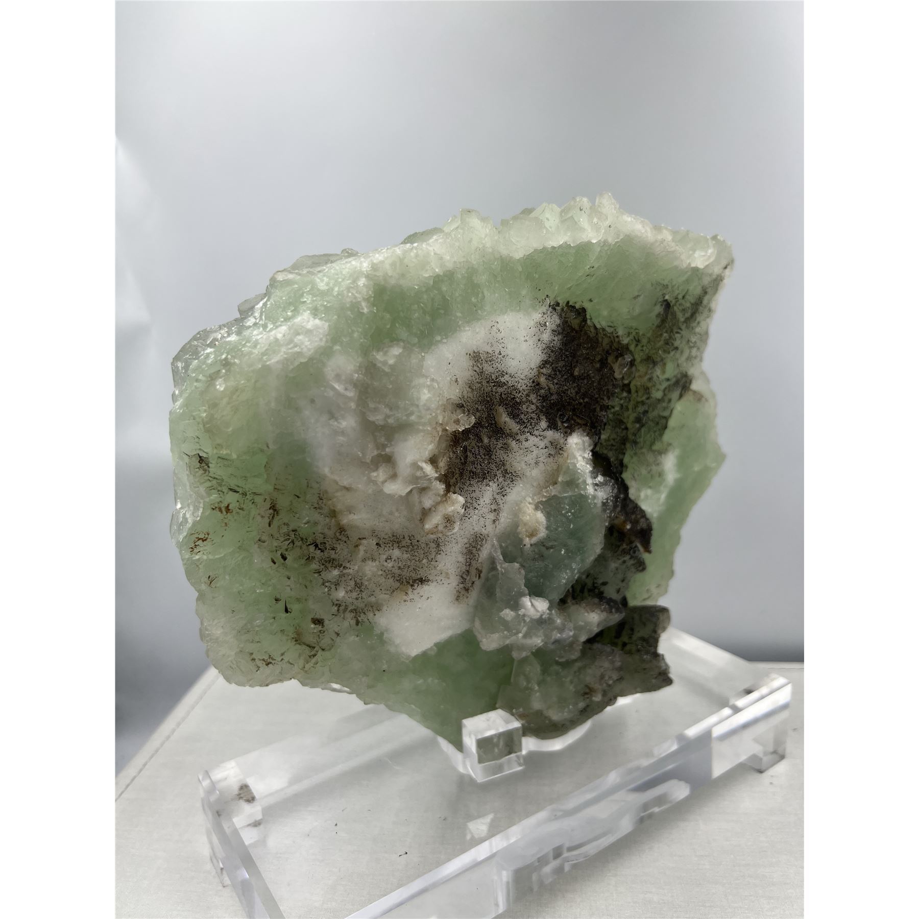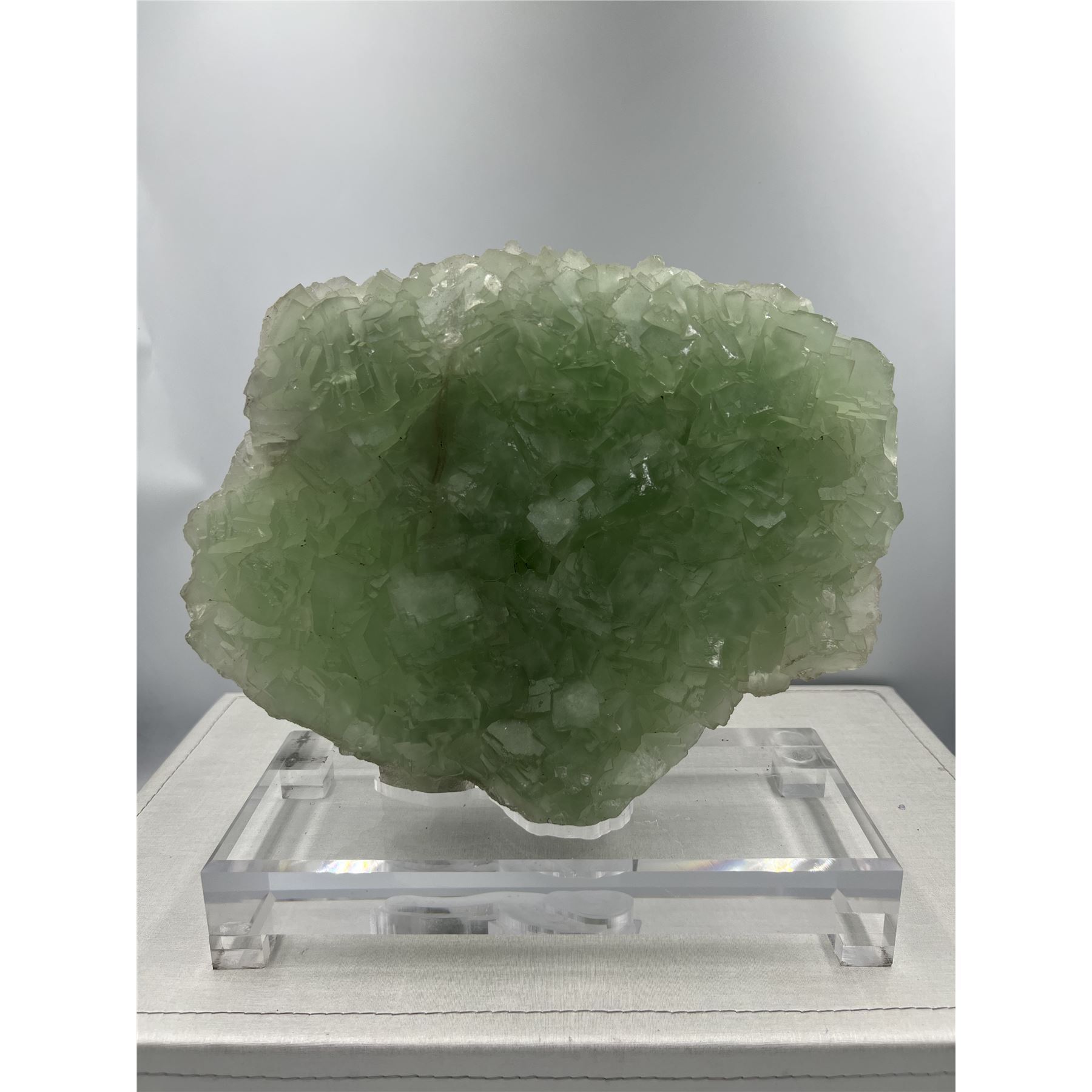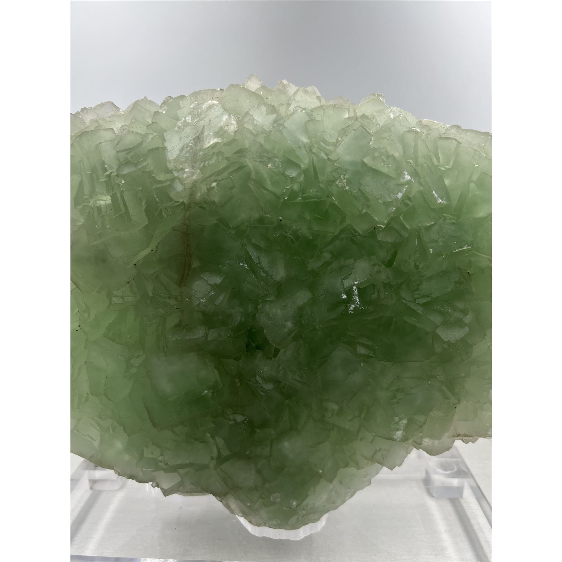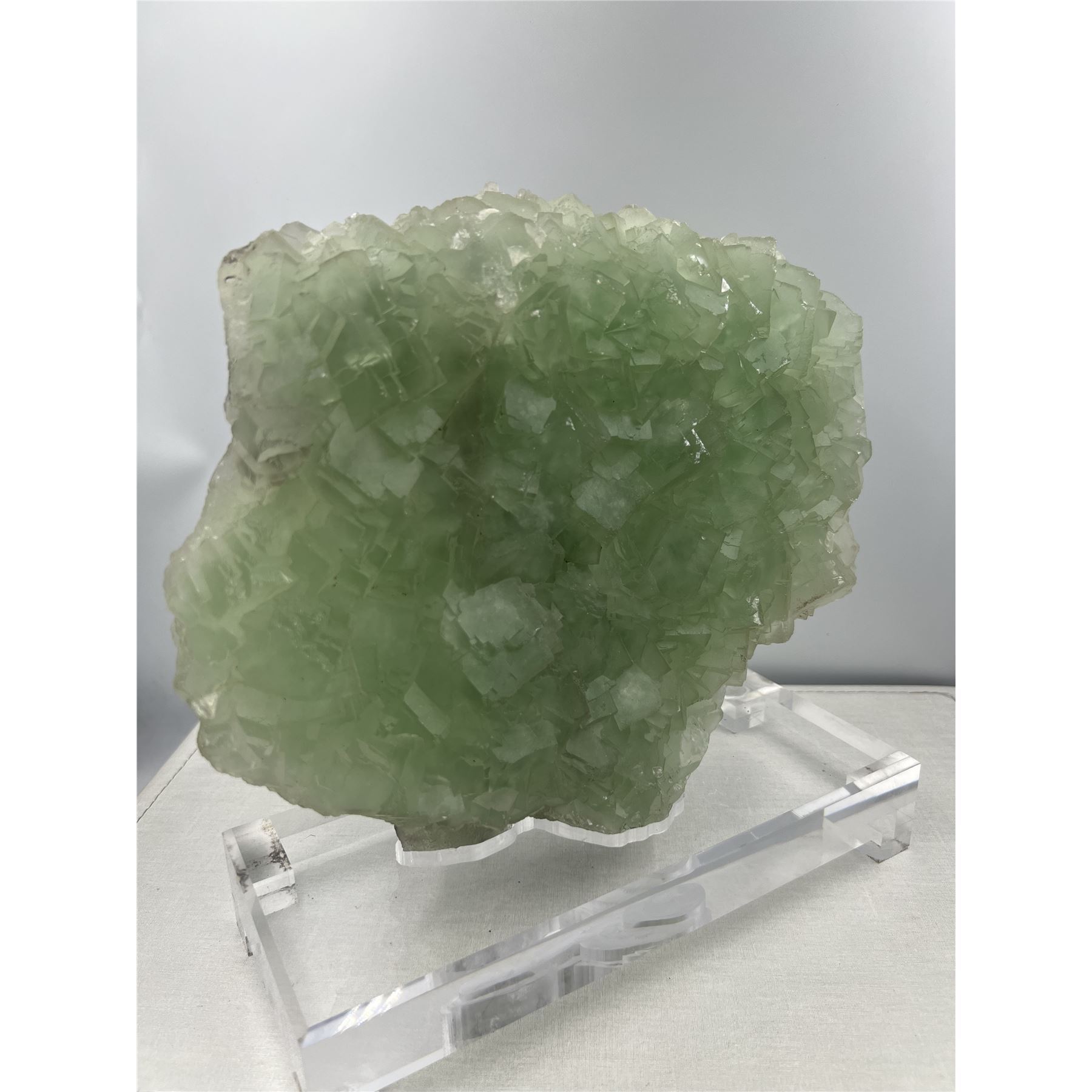 10.5 x 8.5 INCH LARGE GREEN FLUORITE SPECIMEN COLLECTOR PIECE . BACK SIDE INCULSION . ARCLYIC BASE INCLUDED .