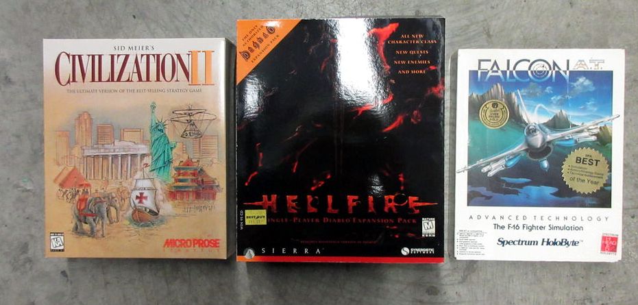 Civilization II, Hellfire - Single Player Diablo Expansion Pack, Falcon A.T. - The F-16 Fighter Simulation & more. Some are sealed.