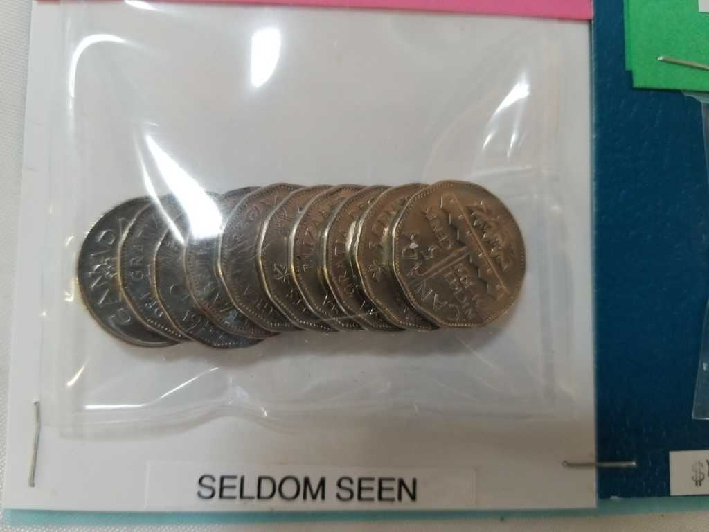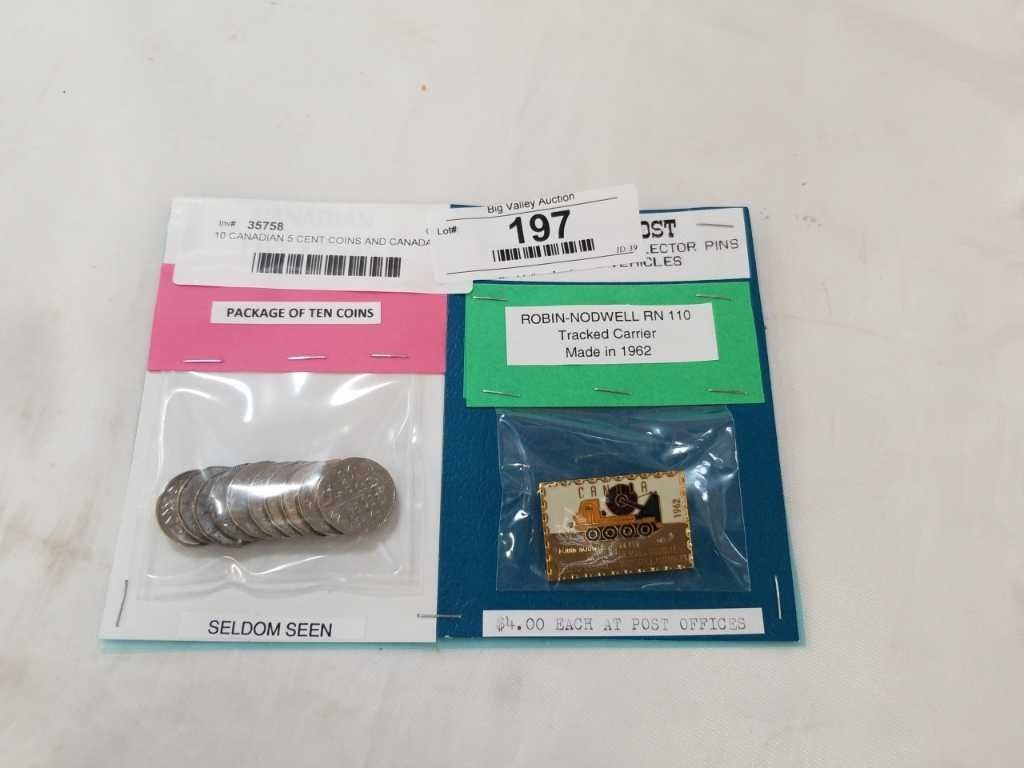 10 CANADIAN 5 CENT COINS AND CANADA POST COLLECTORS PIN