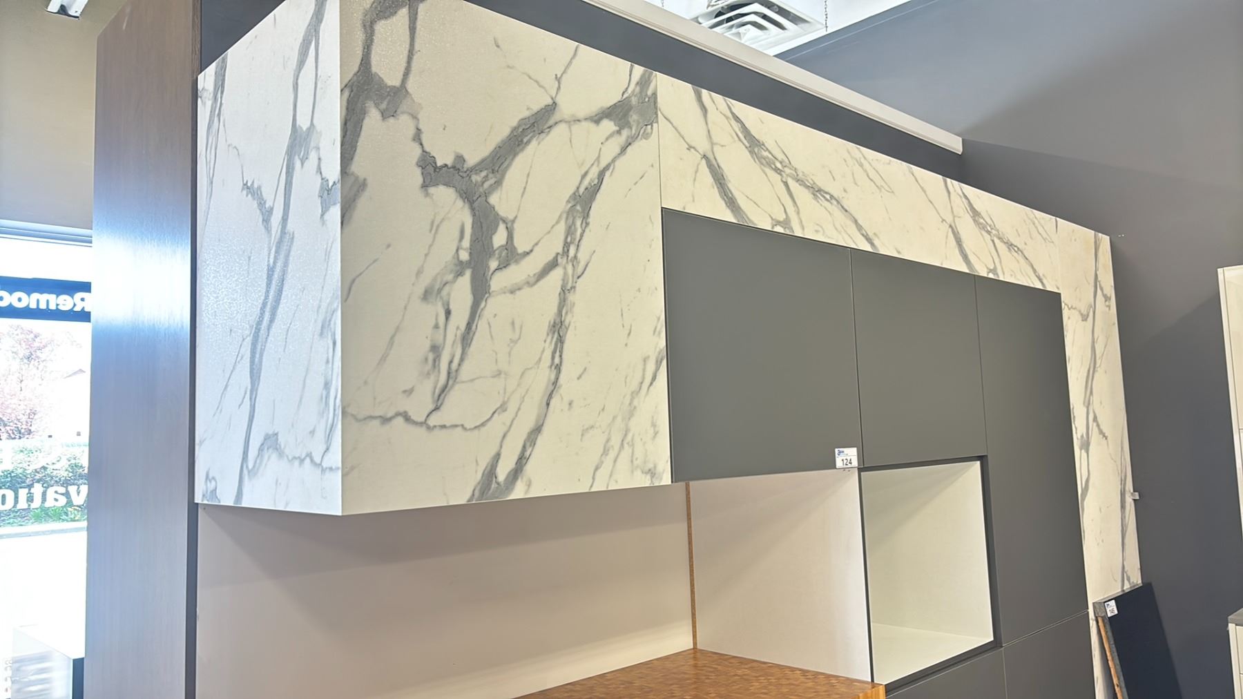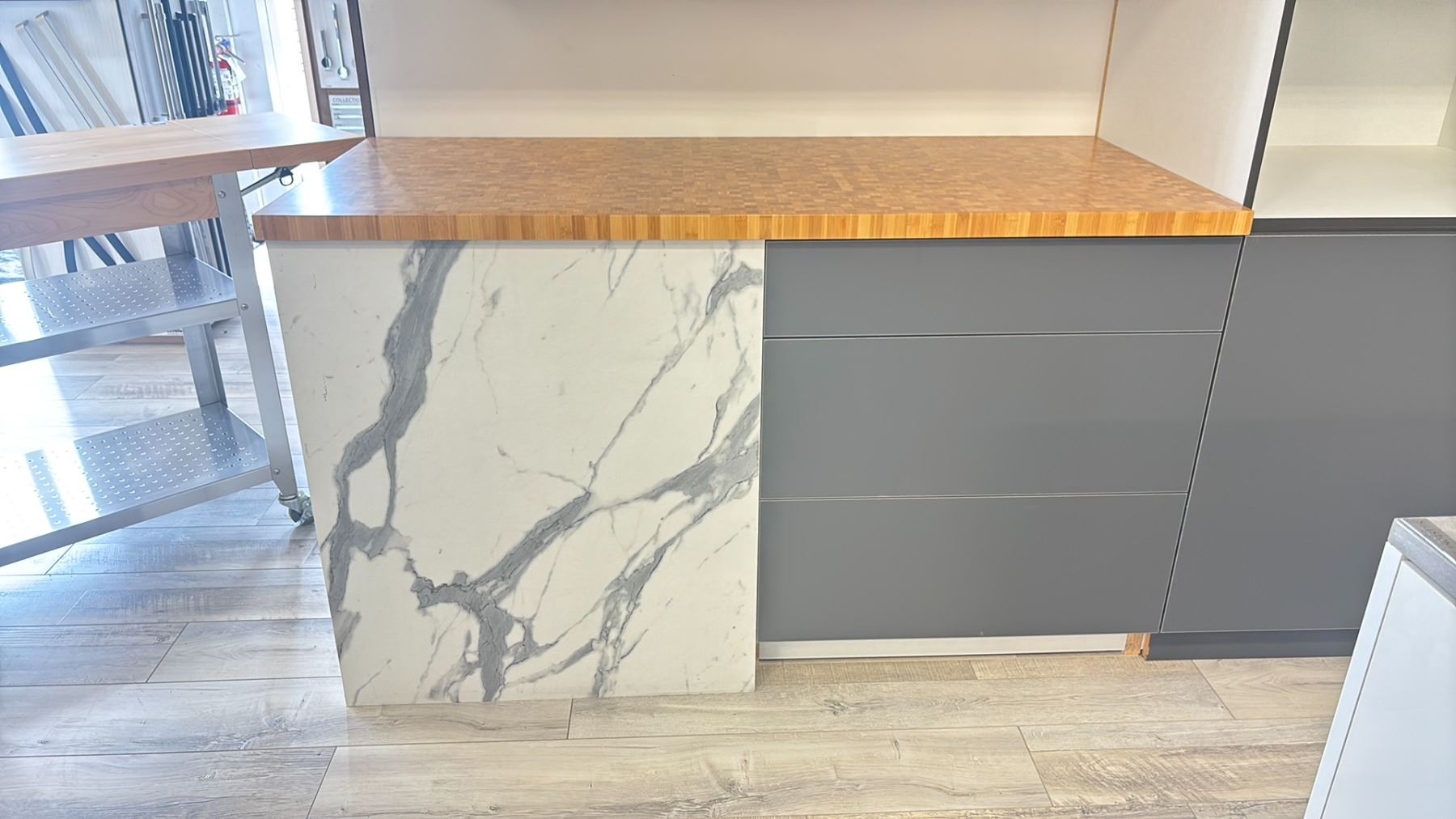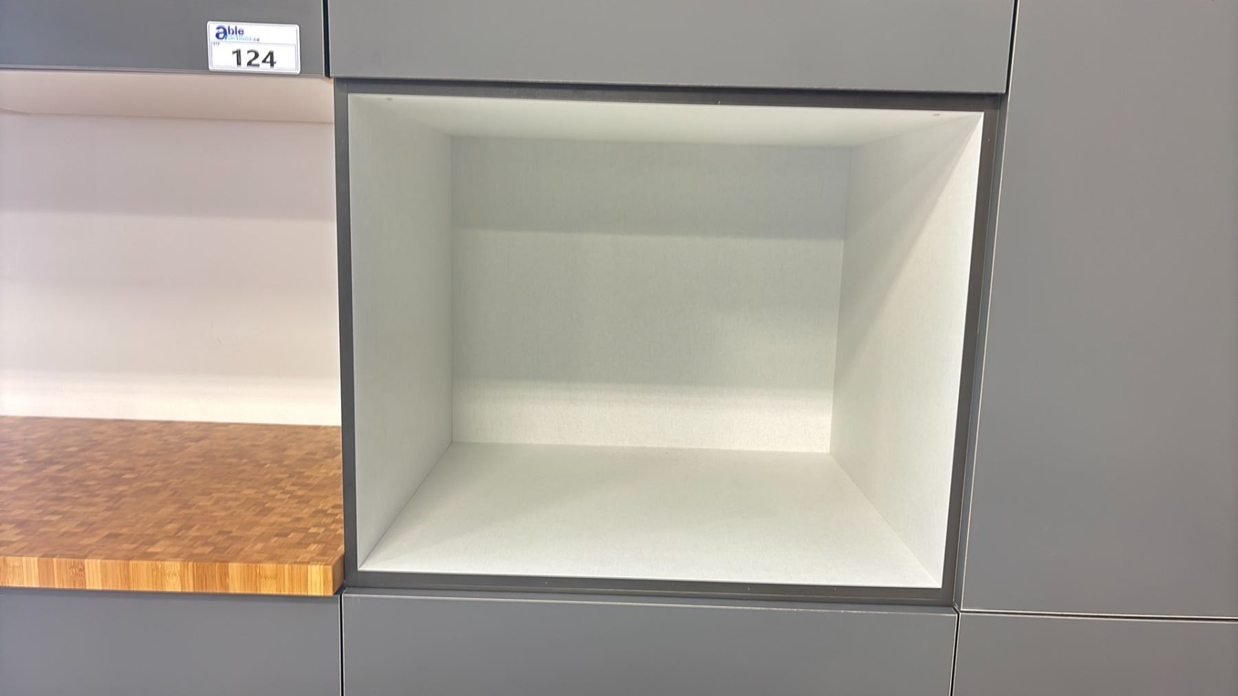 10 DRAWER GREY CABINET WITH WHITE STONE TOP - APPROX.48" ACROSS X 22" WIDE X 41" HIGH CABINETS WILL NEED TO BE REMOVED FROM THE WALL BY THE SUCCESSFUL BIDDER - PLEASE BRING HELP, MANPOWER