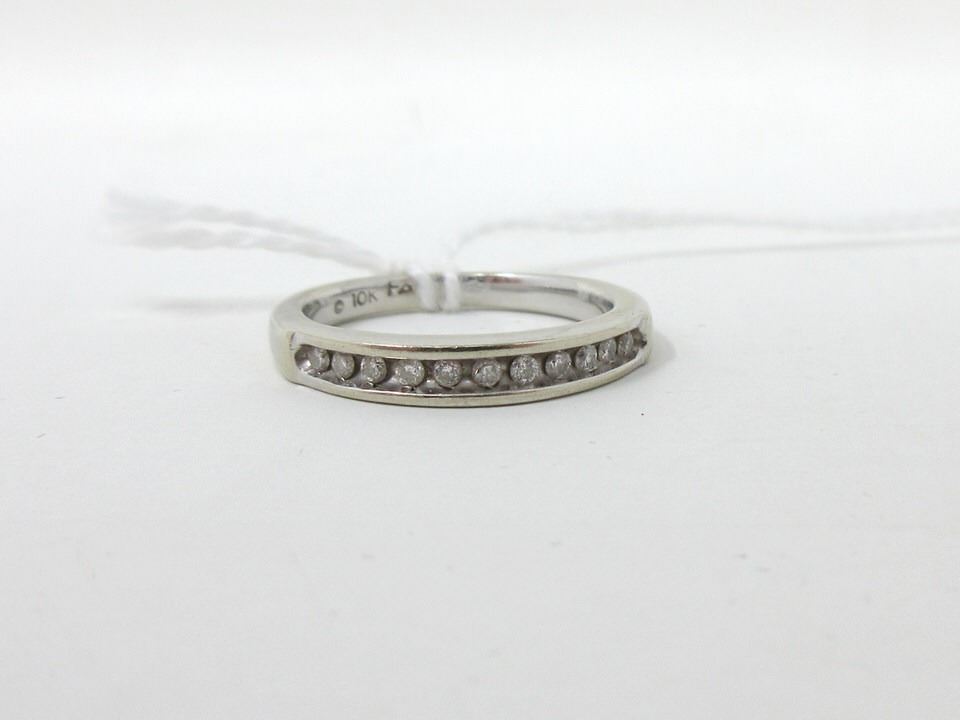 3.3 mm wide gold band is set with 11 Channel set diamonds weighing .17 CTW. Size 7. Total weight including diamonds: 3.5 grams.
