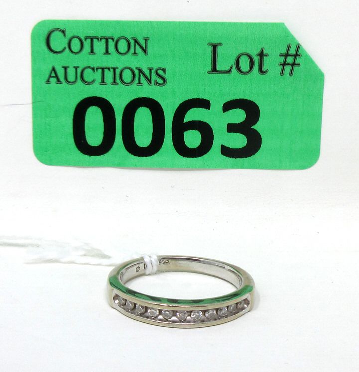 3.3 mm wide gold band is set with 11 Channel set diamonds weighing .17 CTW. Size 7. Total weight including diamonds: 3.5 grams.