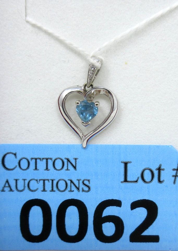 Heart shaped synthetic aquamarine is 5 x 5.5 mm. Pendant measures 14 x 15 mm. Total weight including gemstone is 1.2 grams.