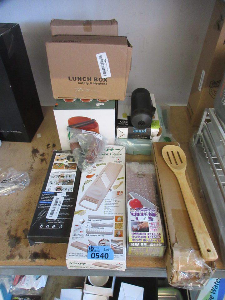 Lunch box, wood mixing tools, whet stone, Japanese mandolin, Nanopresso and more.