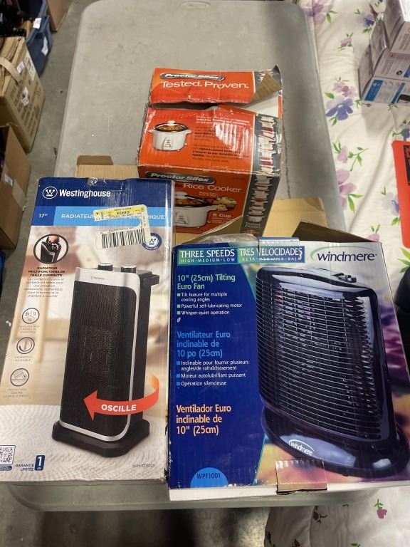 10" TILTING FAN, CERAMIC TOWER HEATER AND SMALL CROCK POT