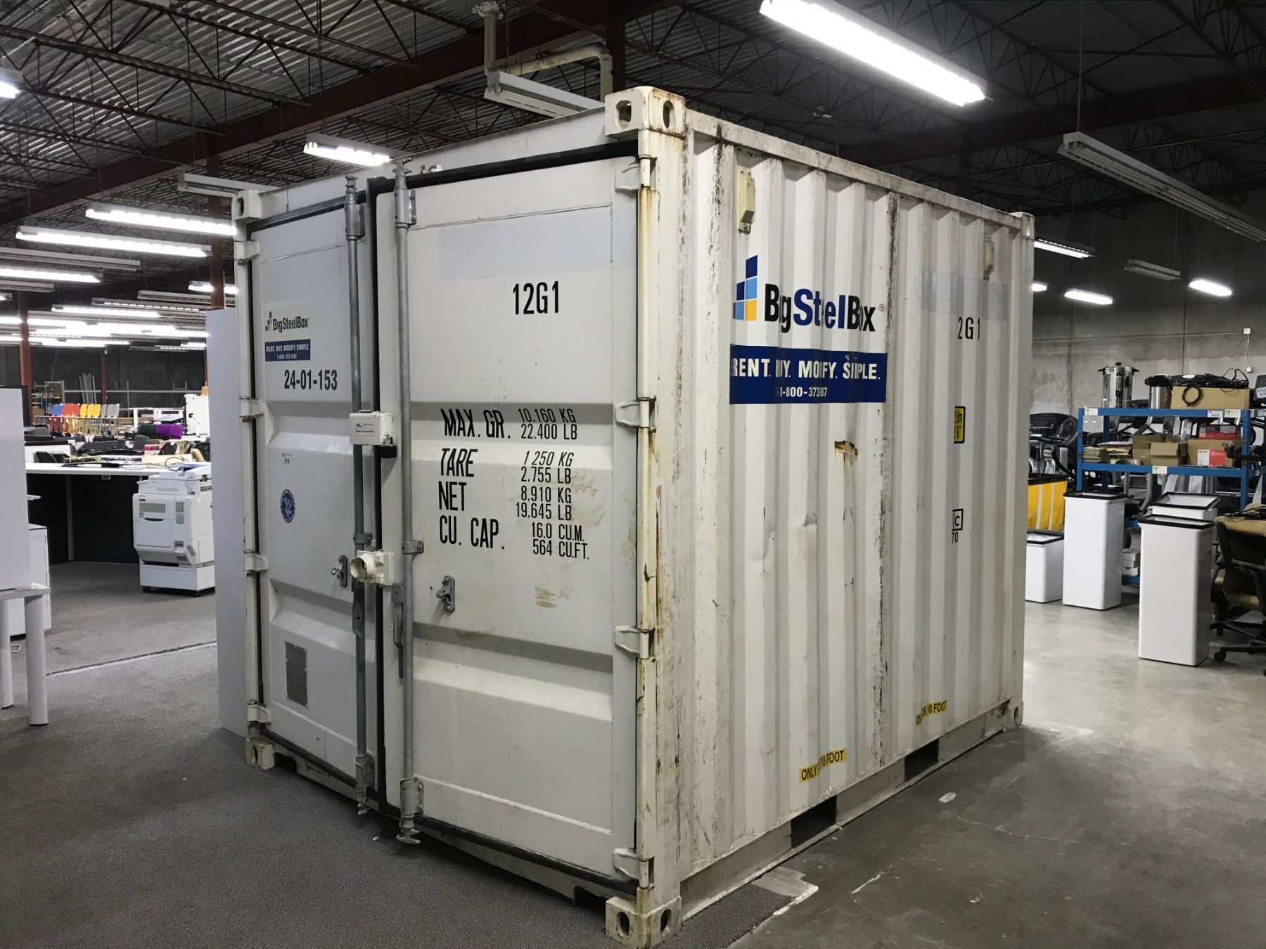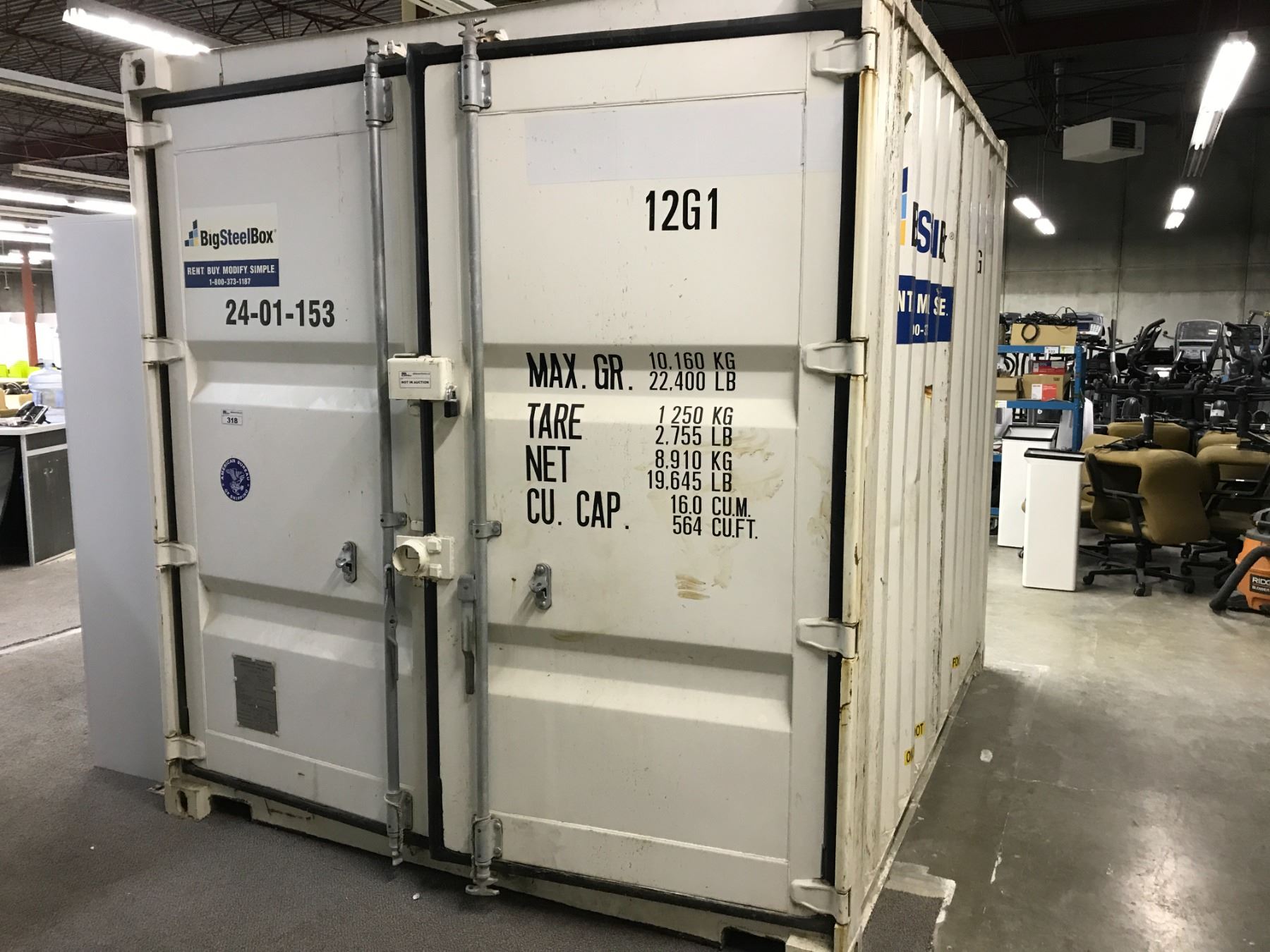 10' X 10' STEELCASE SHIPPING CONTAINER WITH 2 BARN DOOR STYLE DOORS AND INTERNAL STORAGE SHELVES