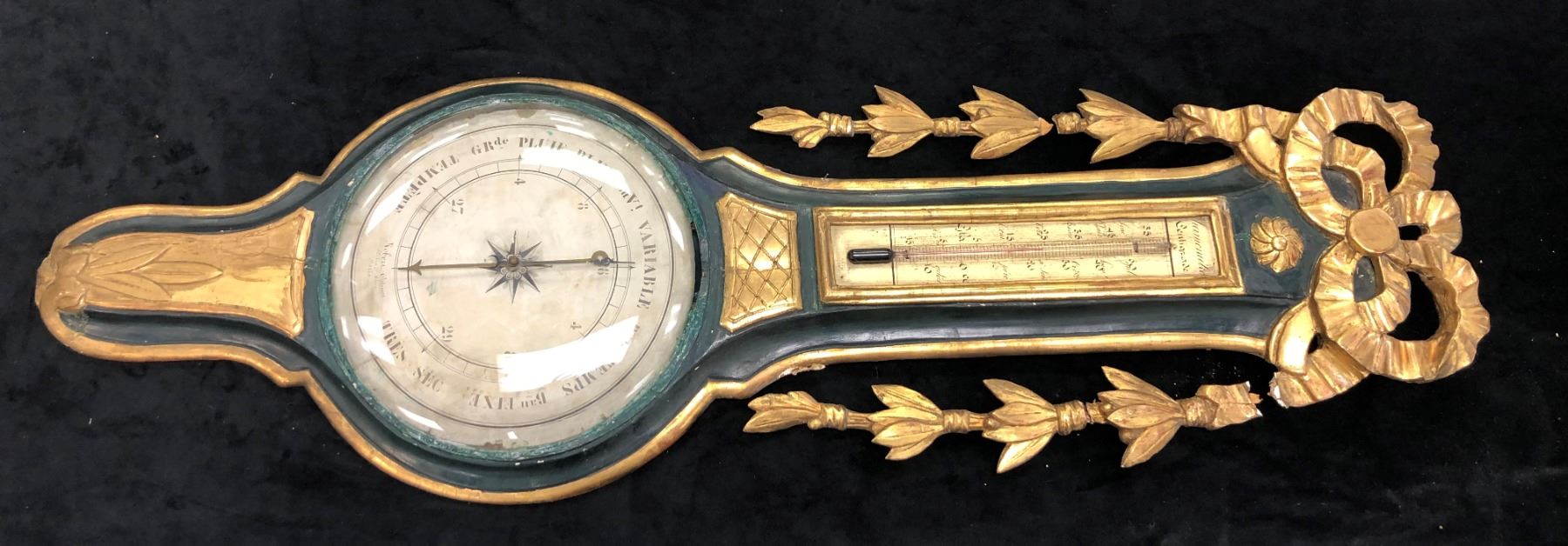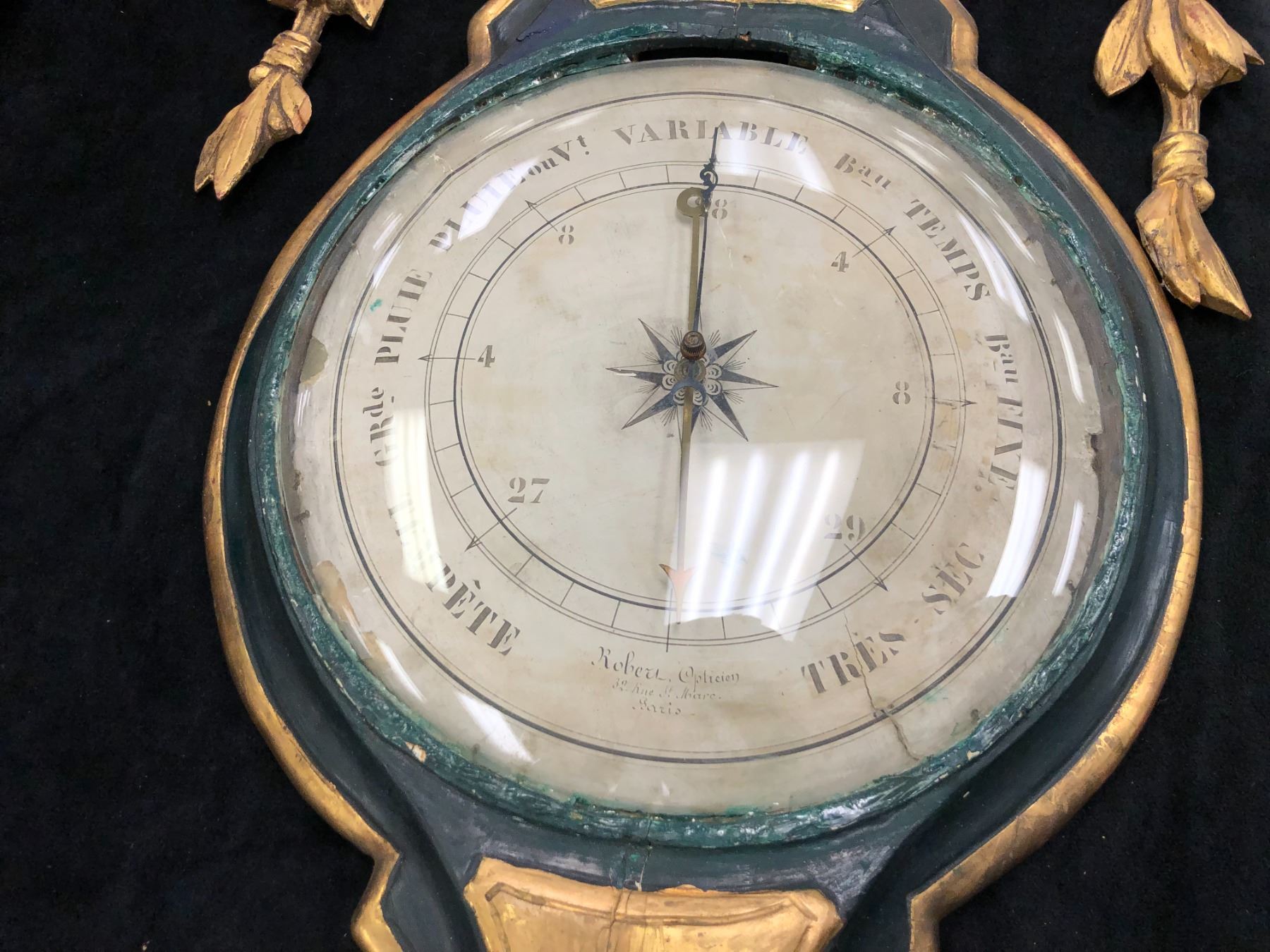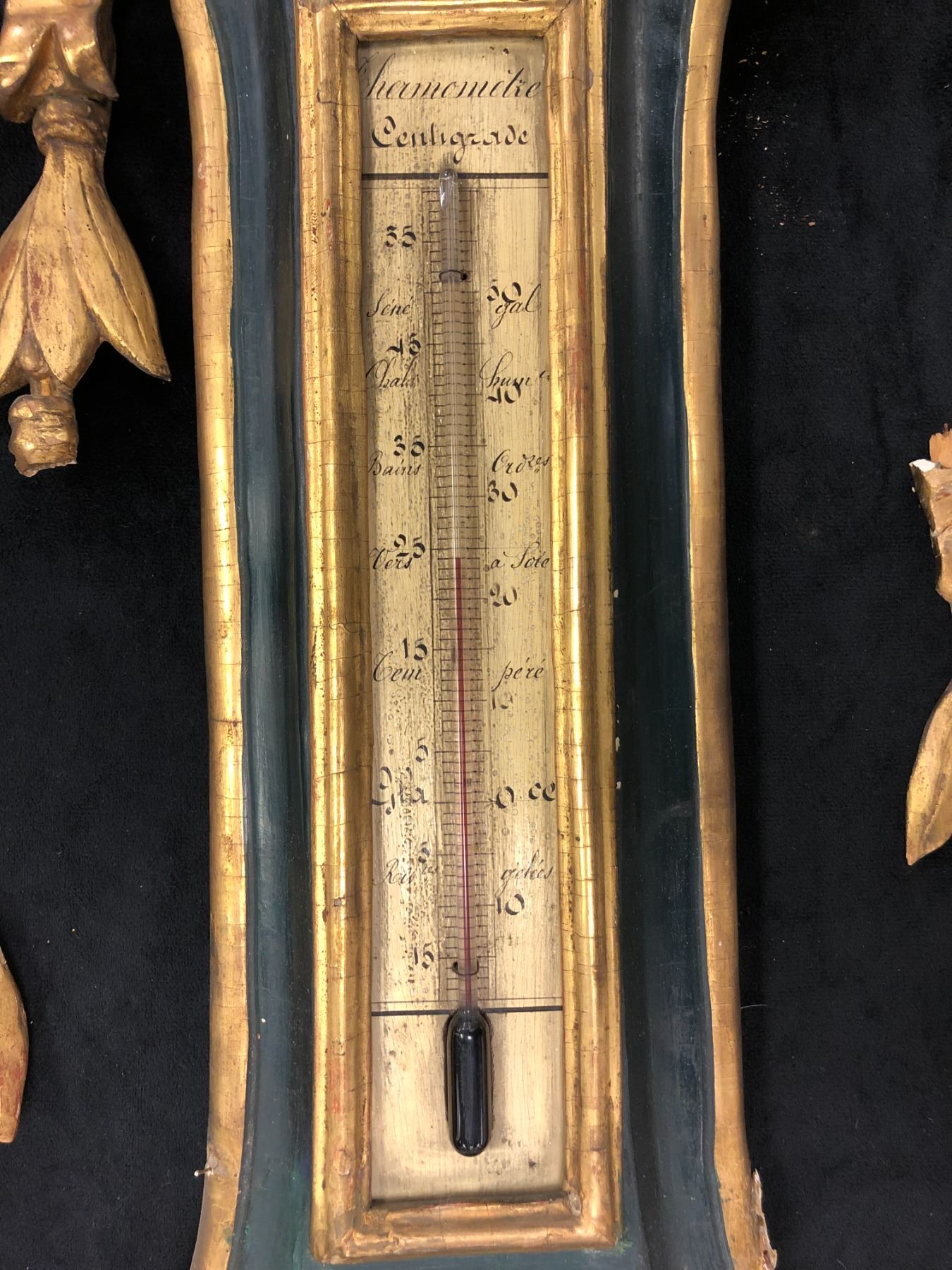 100+ years old gilded large barometer/ thermometer - Robert Oplician Paris, France (green w/ gilded finish) (2 breaks to hanging gold leaves)